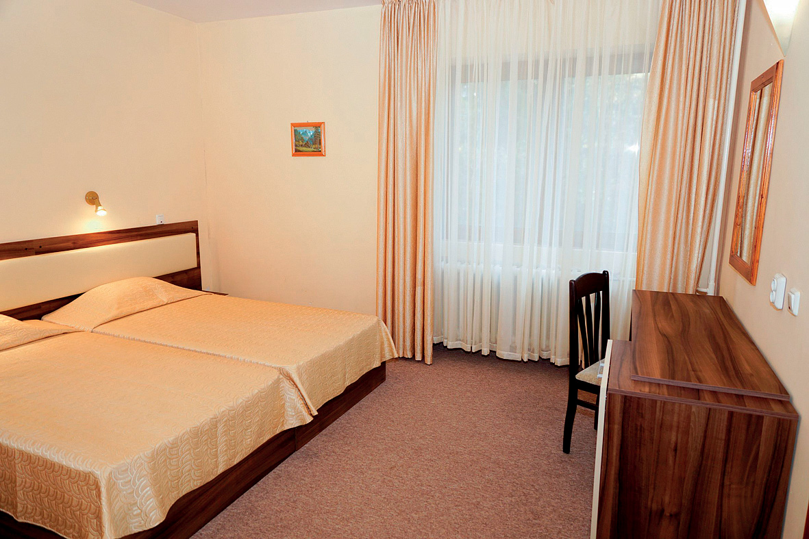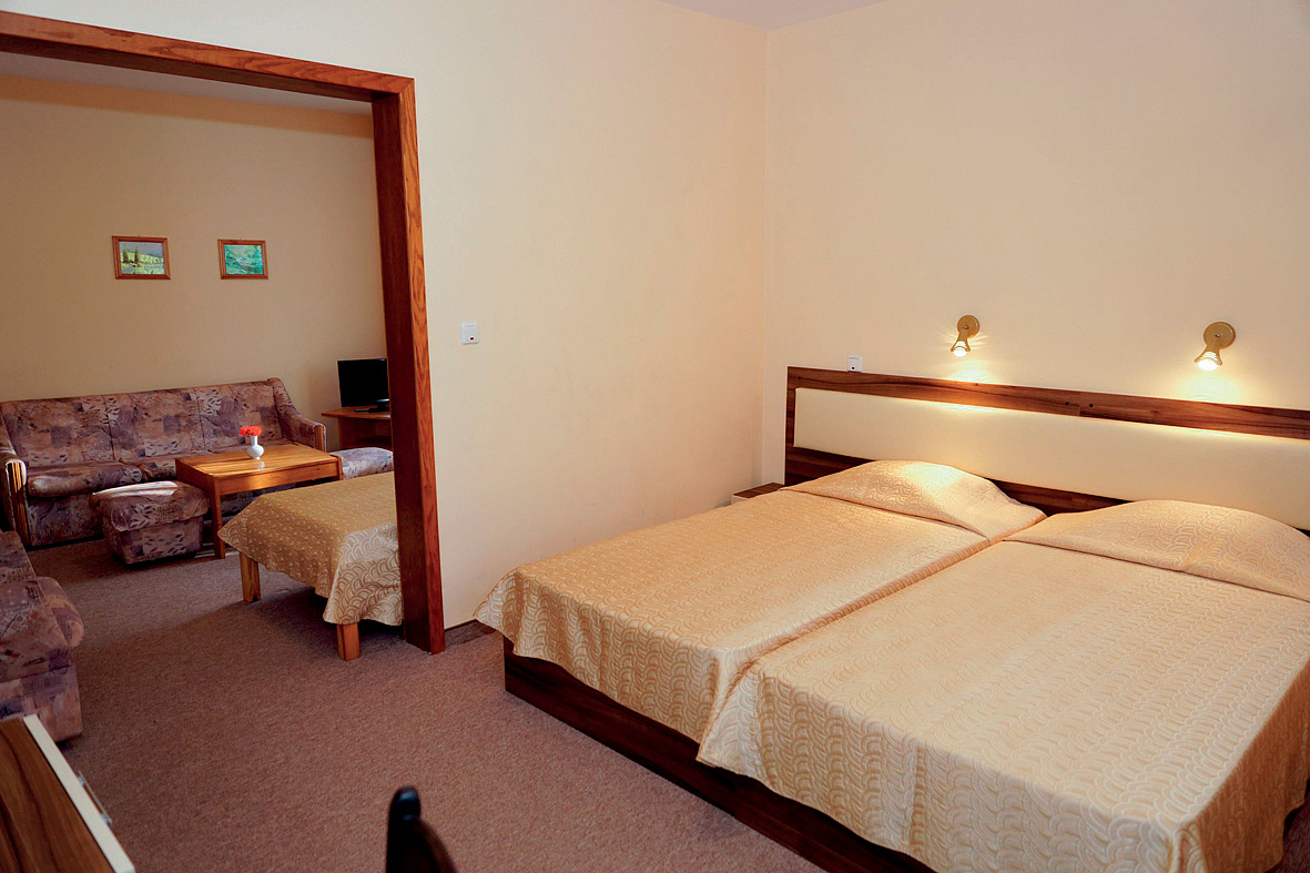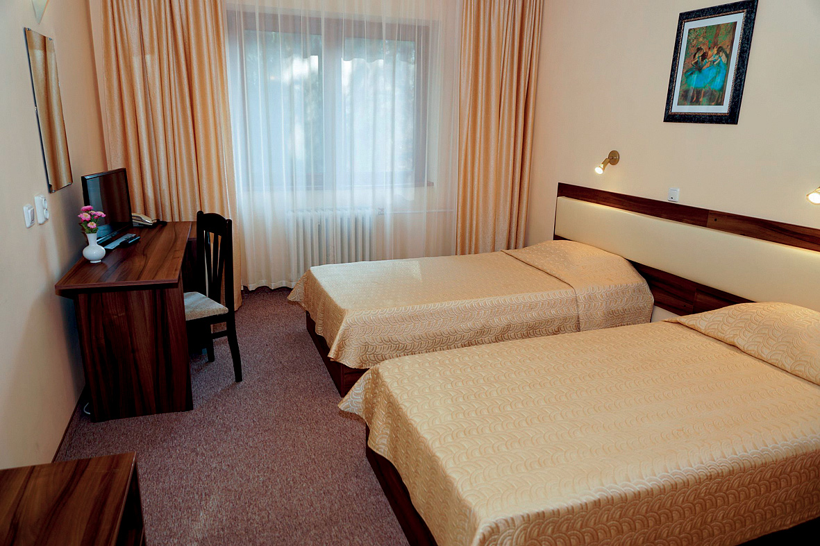pokoj s manželskou postelí s oddělitelnými lůžky a případně rozkládacím křeslem na lůžko pro 1 osobu, sociální zařízení zpravidla se sprchou, z 50 % balkon