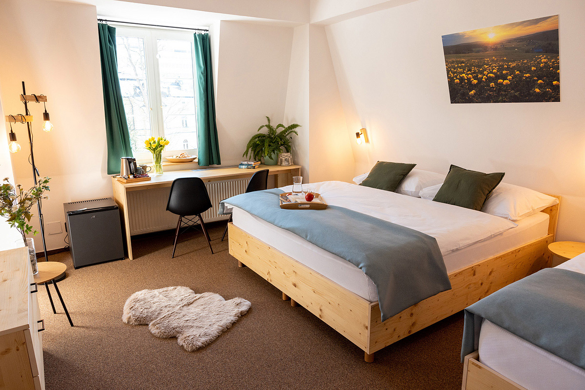 Standard 2/3 - pokoj s manželskou postelí či s oddělitelnými lůžky, s možností 1 přistýlky, sociální zařízení