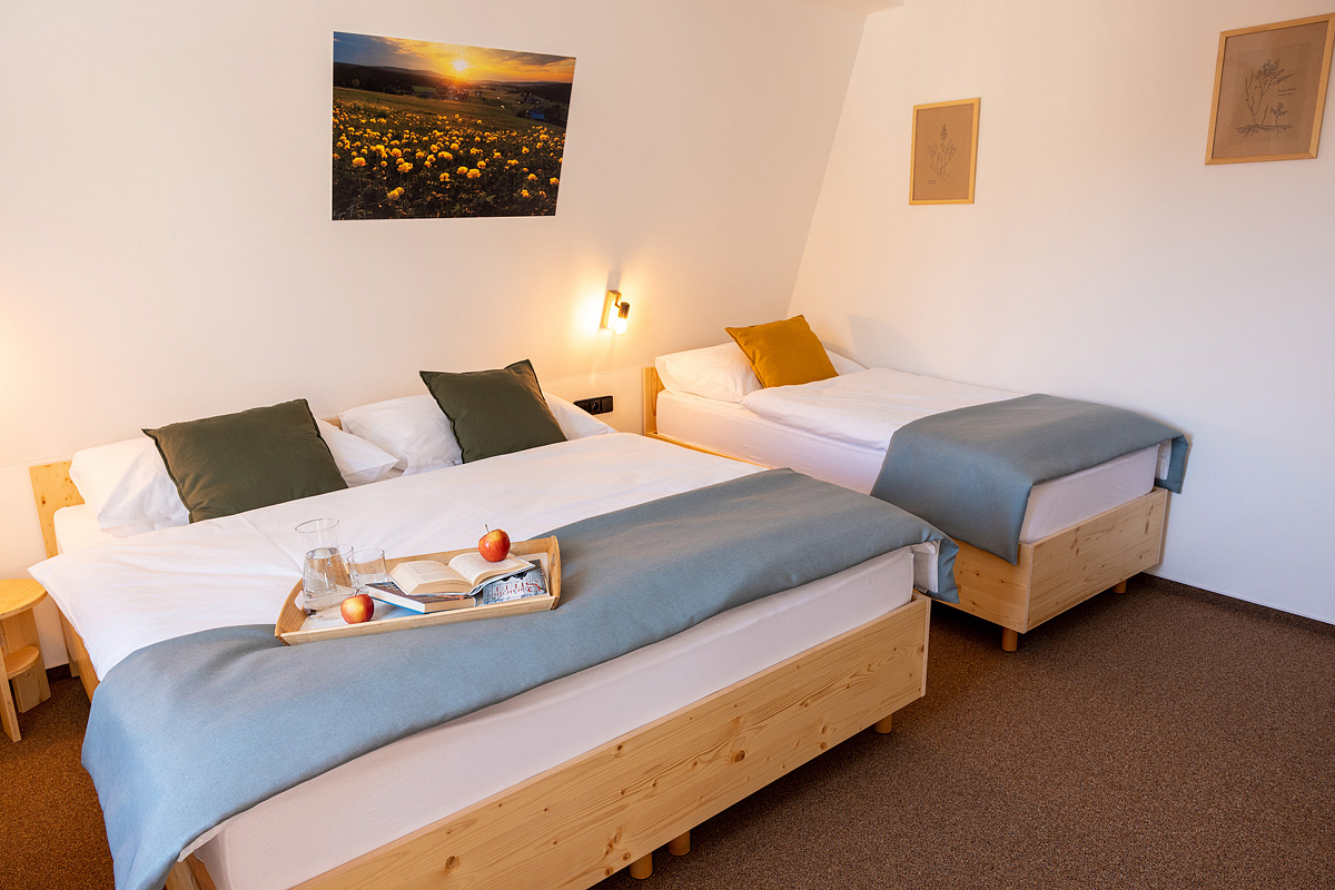 Standard 3 - pokoj s manželskou postelí či s oddělitelnými lůžky a 1 samostatným lůžkem, sociální zařízení