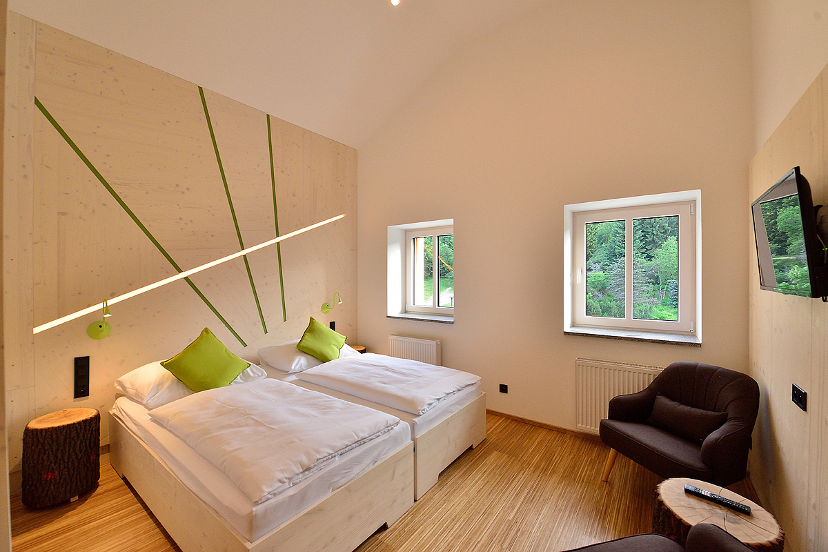 20 m² - pokoj s manželskou postelí či s oddělitelnými lůžky a možností 1 přistýlky, sociální zařízení