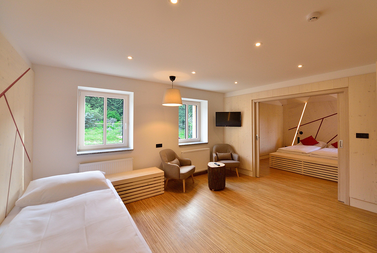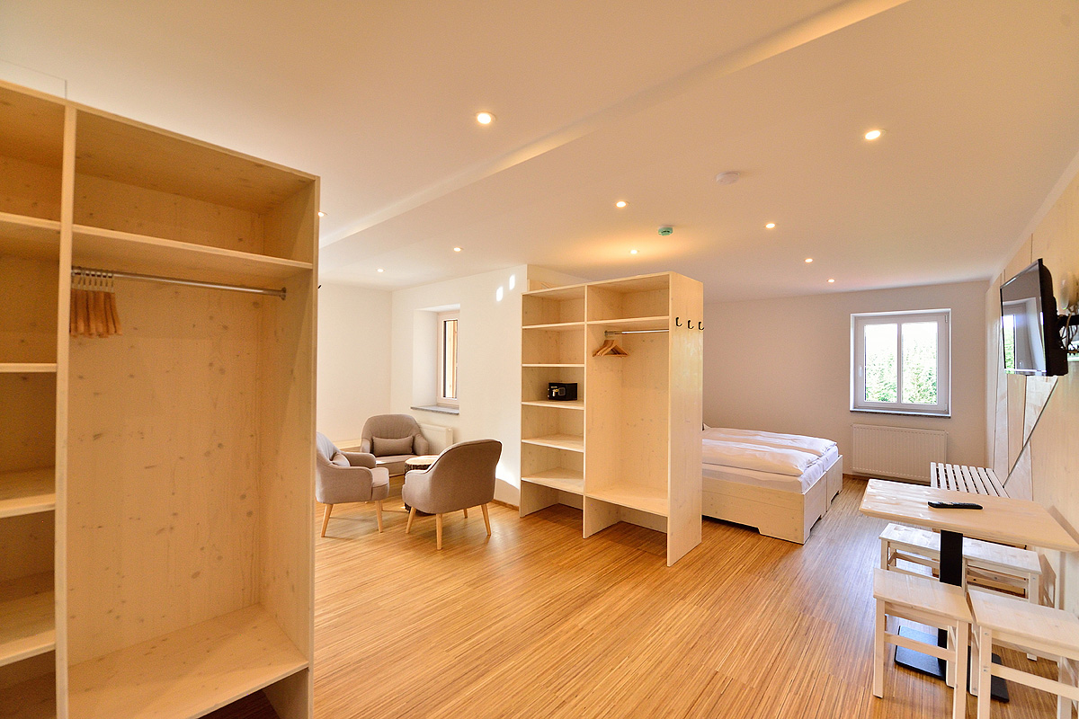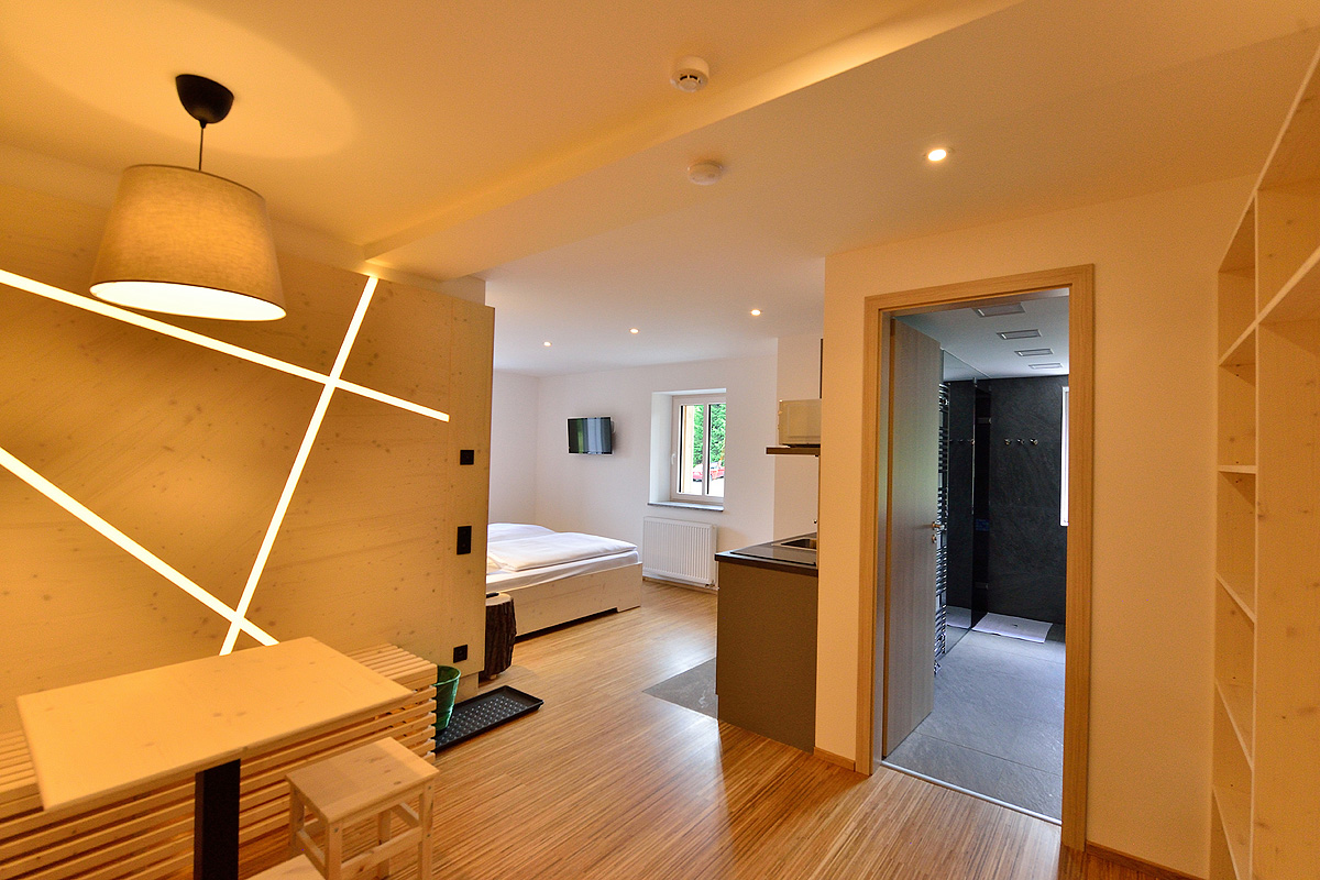35 m² - pokoj s kuchyňským koutem, manželskou postelí a možností 2 přistýlek, sociální zařízení; pokoj lze propojit dveřmi