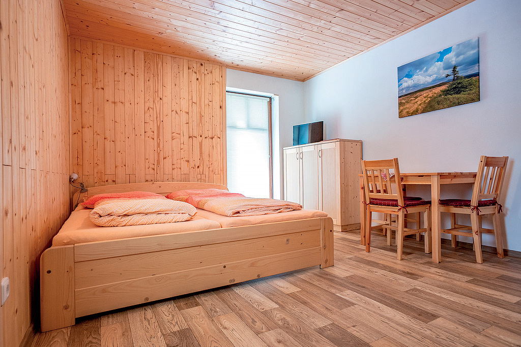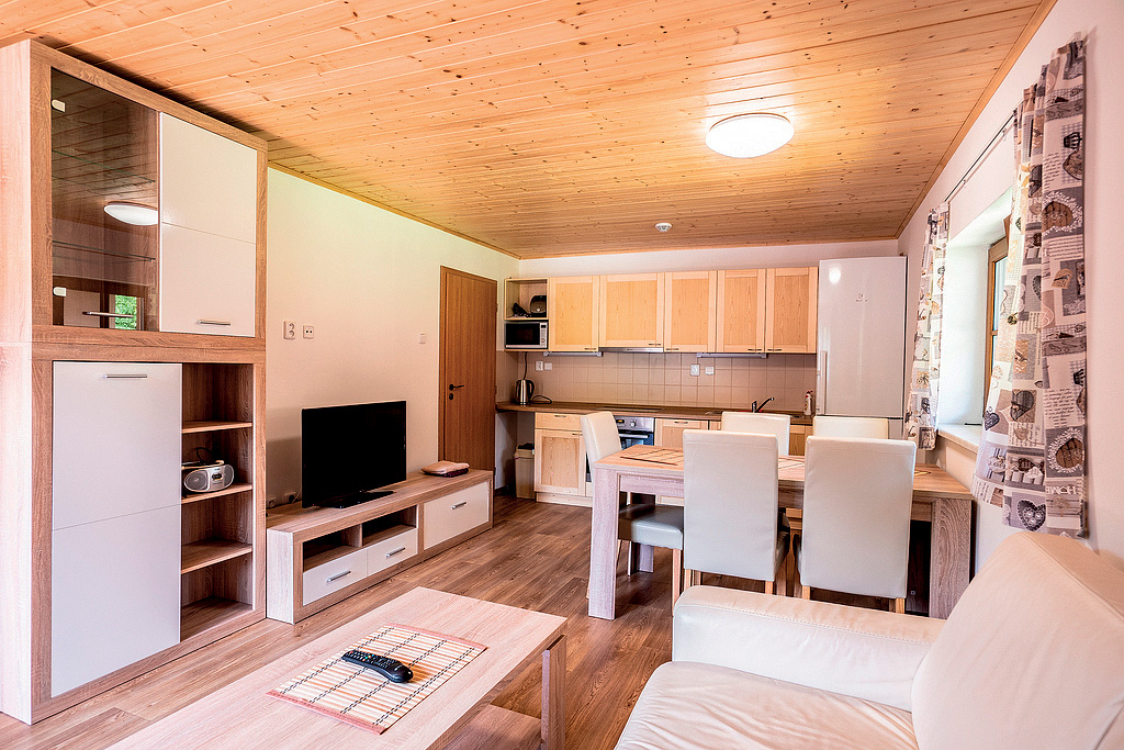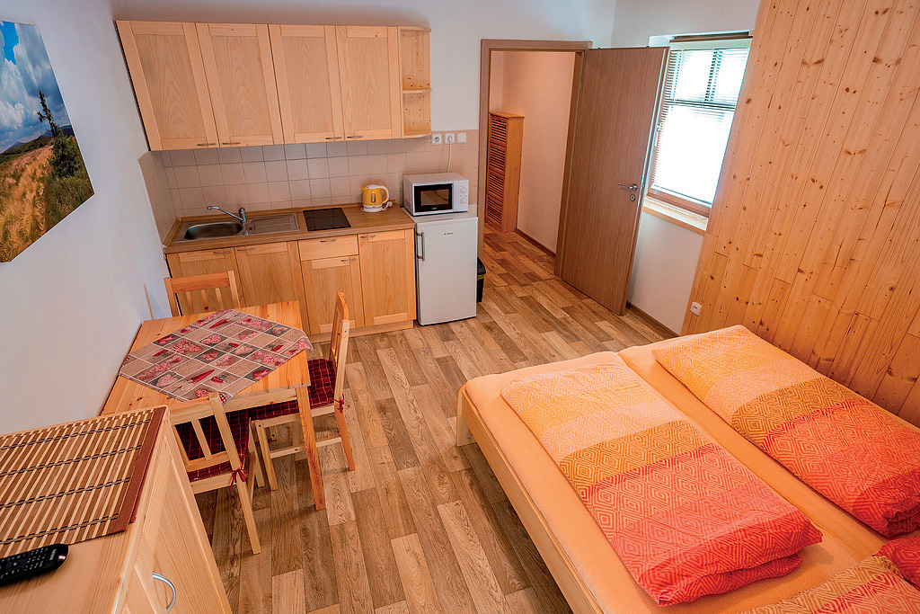obývací pokoj s kuchyňským koutem, manželskou postelí a případně rozkládacím křeslem na lůžko pro 1 osobu, sociální zařízení, zřídka balkon
