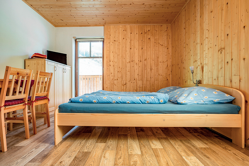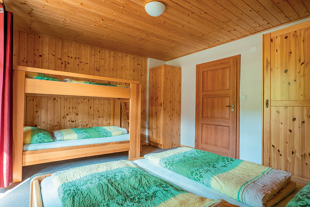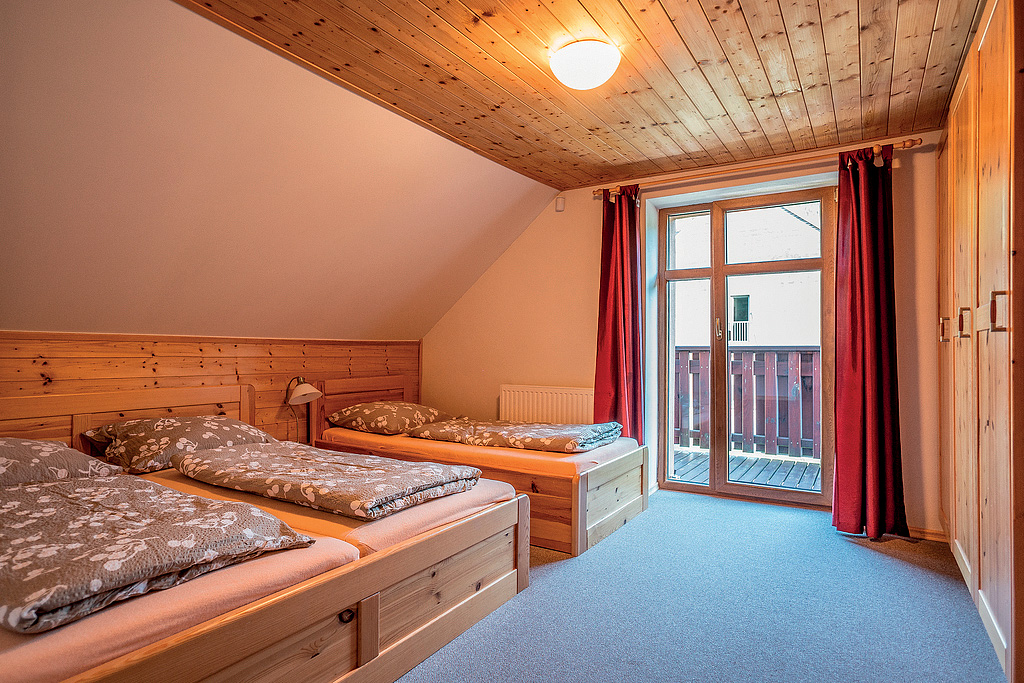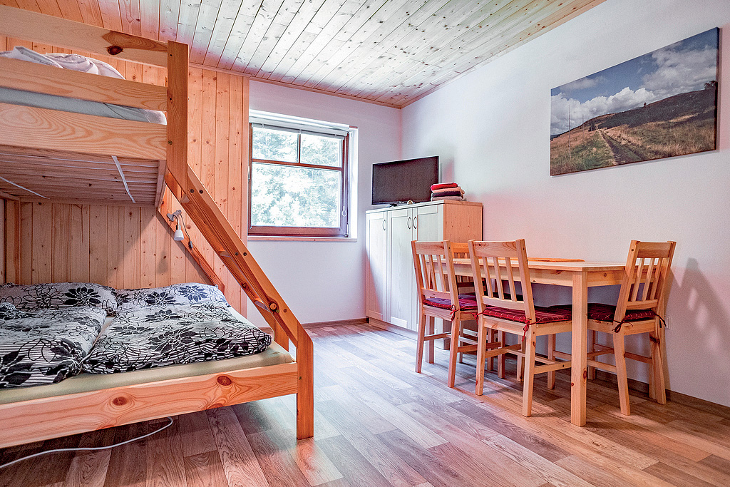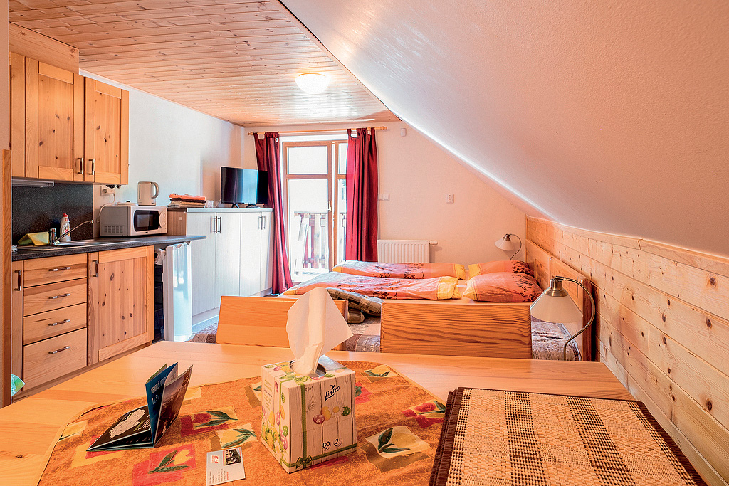 1 ložnice s palandou, obývací pokoj s kuchyňským koutem a atypickou palandou, kde nad manželskou postelí je v patře další lůžko, sociální zařízení