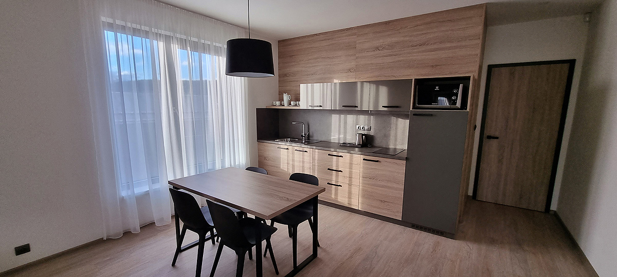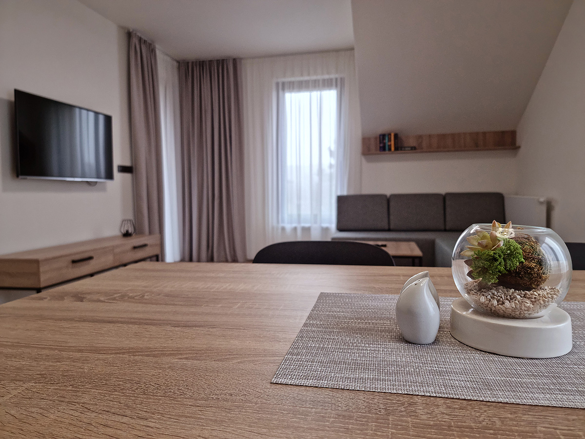 45 m² - ložnice s manželskou postelí či 2 oddělitelnými lůžky, obývací pokoj s kuchyňským koutem a rozkládacím gaučem pro až 2 osoby do nedovršených 18 let, sociální zařízení, balkon