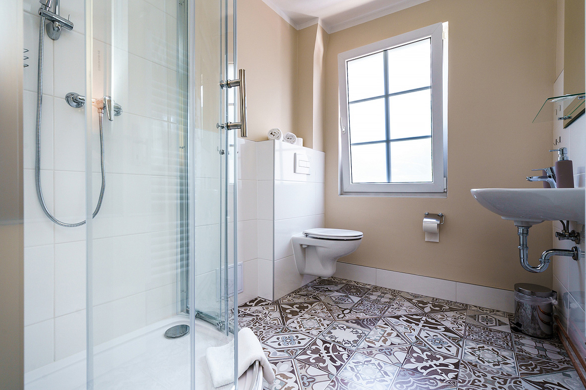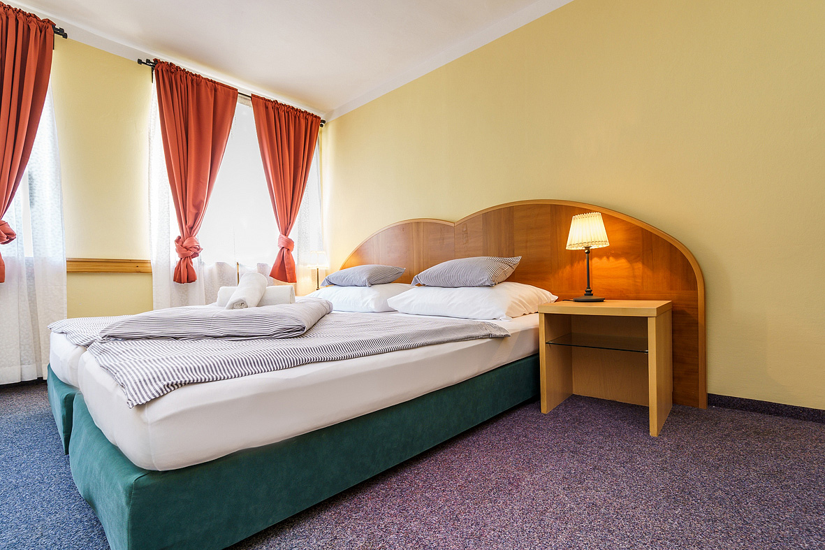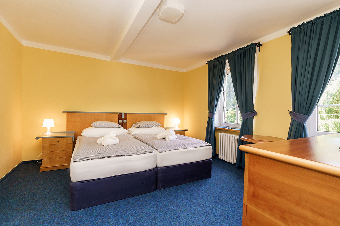 pokoj s manželskou postelí s oddělitelnými lůžky, sociální zařízení se sprchou; možnost 1 přistýlky