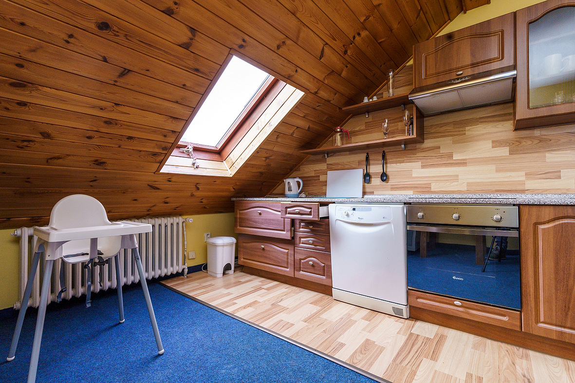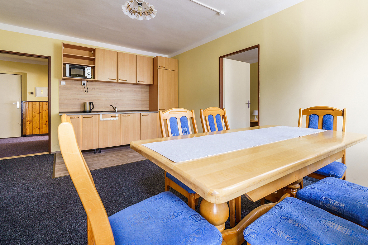 ložnice s manželskou postelí s oddělitelnými lůžky a samostatním lůžkem, další ložnice s manželskou postelí a další ložnice se 2 samostatnými lůžky, obývací pokoj s kuchyní, sociální zařízení se sprchou; maximální kapacita 7 osob, pro nižší počet rádi připravíme cenovou kalkulaci