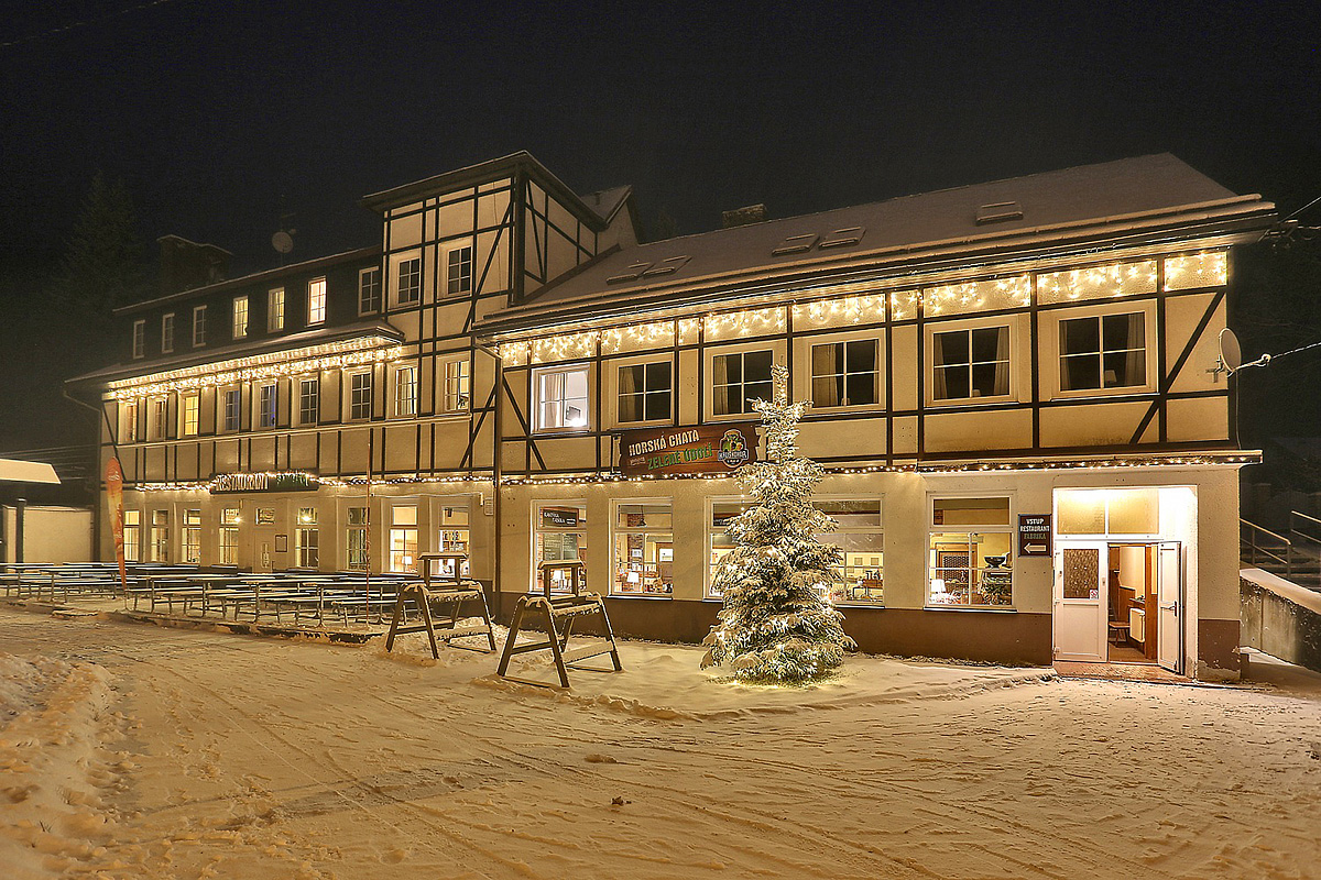 horský hotel u sjezdovky a nástupní stanice lanovky na Plešivec
