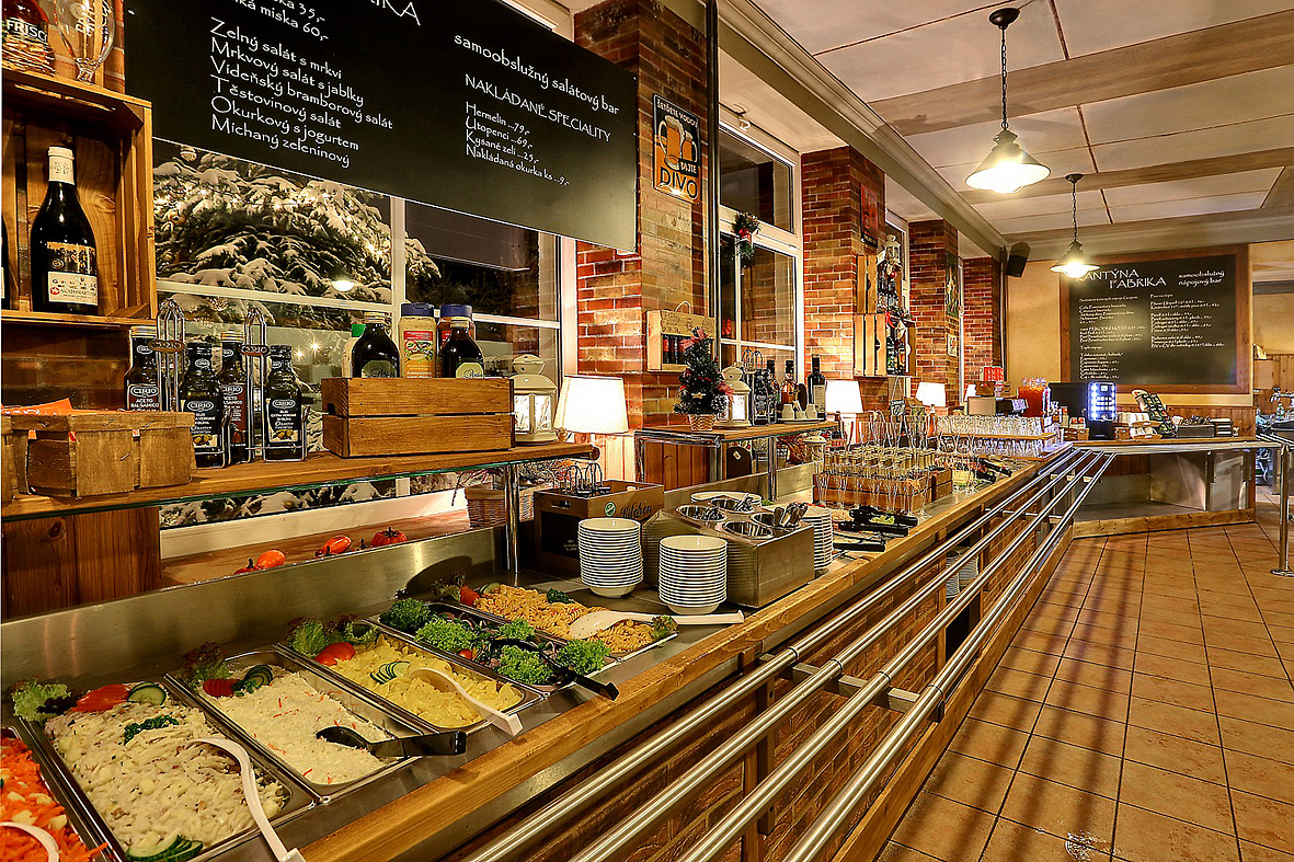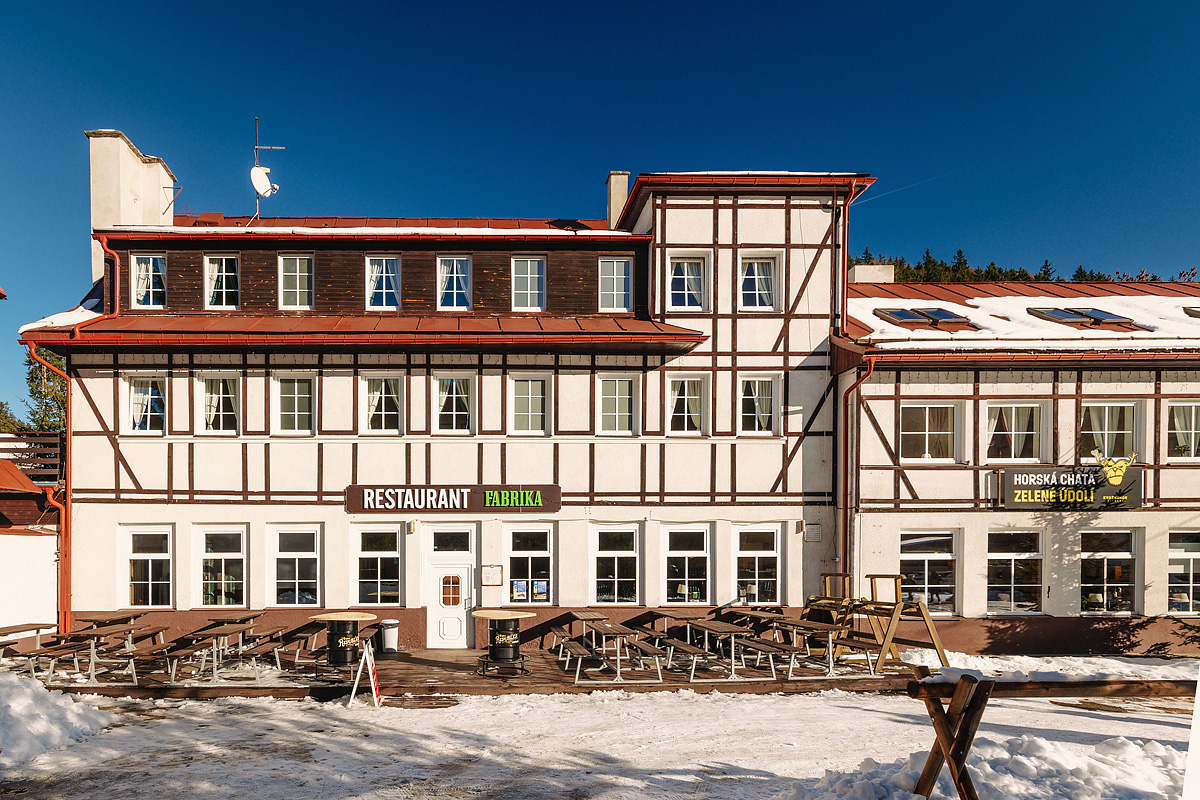 recepce, stylová restaurace s barem, velká terasa s posezením, wi-fi připojení k internetu, místnost pro úschovu zavazadel, lyžárna, parkoviště, půjčovna* lyží