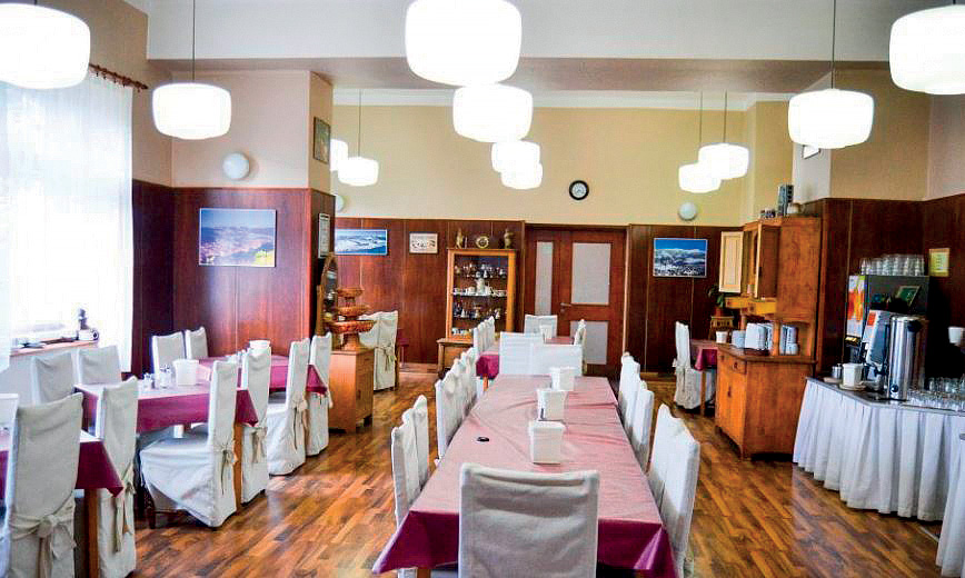 formou bufetu nebo při nižším počtu hostů servírované 4-chodové menu s výběrem hlavního chodu, servírovaná polévka, salát, dezert, káva či čaj, ostatní nápoje za poplatek