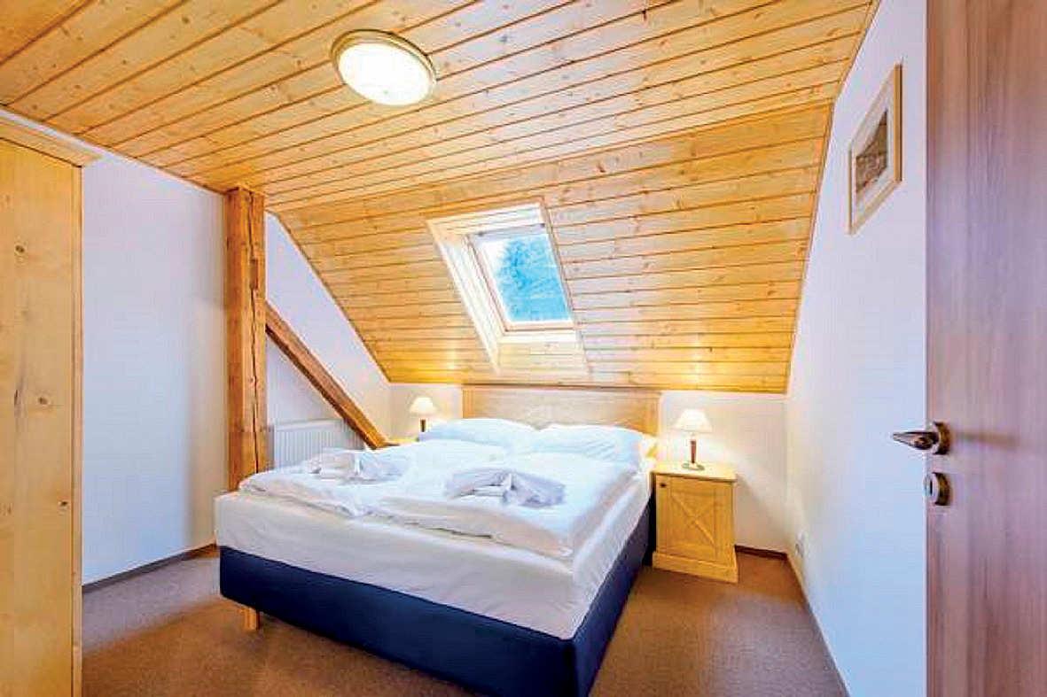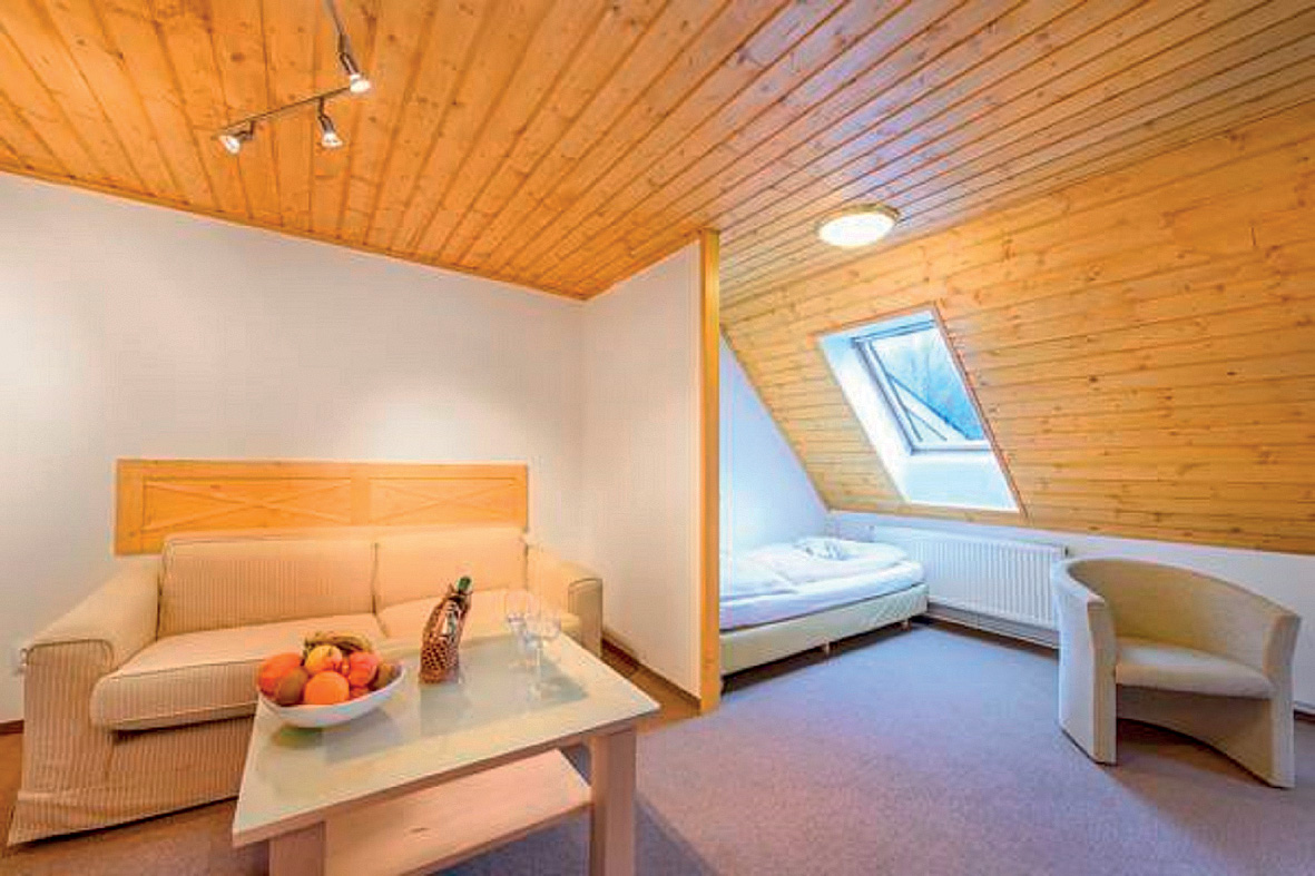 menší pokoj s manželskou postelí či 2 samostatnými lůžky a případně přistýlkou pro 1 osobu, sociální zařízení