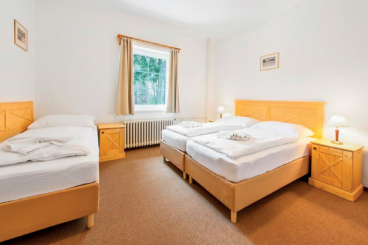 pokoj zpravidla s manželskou postelí a 2 samostatnými lůžky, sociální zařízení