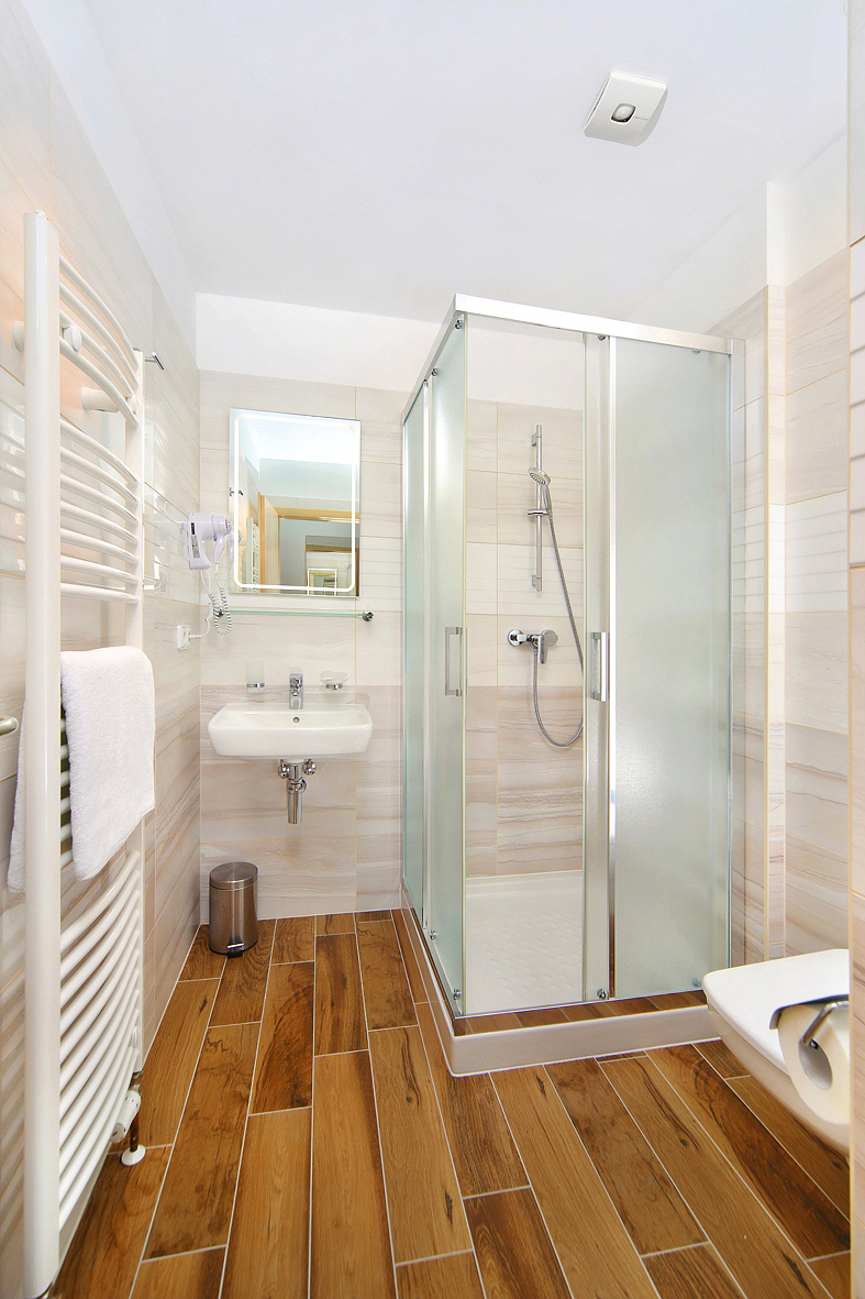 pokoj s manželskou postelí či 2 samostatnými lůžky, sociální zařízení se sprchou; 3. a 4. lůžko formou rozkládacího gauče pro 1 či 2 osoby