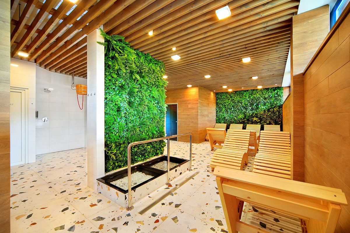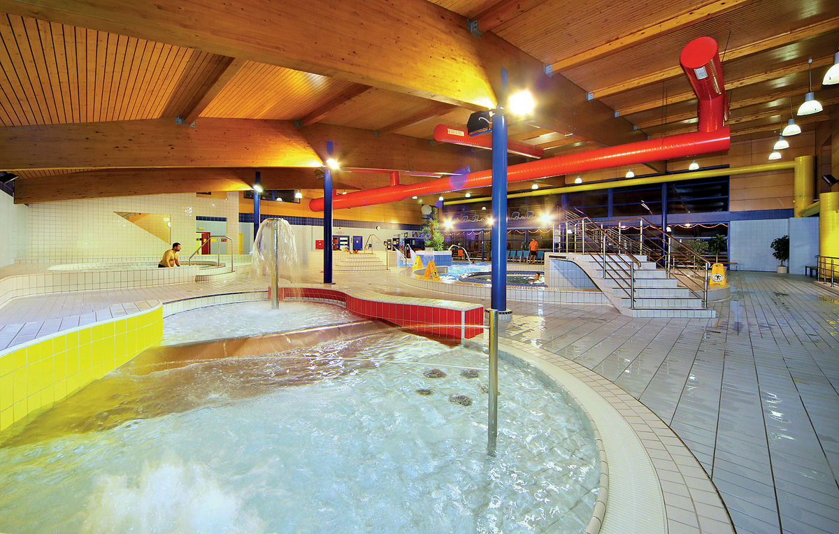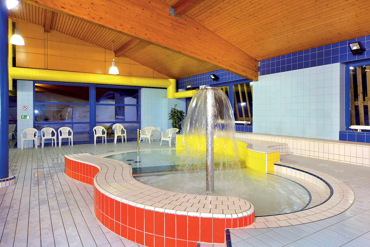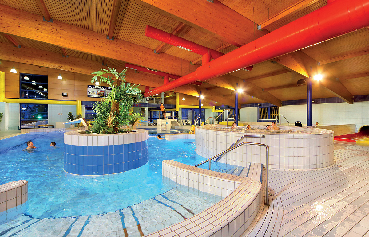 aquapark: rekreační bazén s chrličem vody, dětský bazén, divoká řeka s protiproudem, 3x tobogán, bar, lehátka, solná jeskyně; wellness centrum: venkovní vířivka*, finská sauna*, aromatická sauna*, pára*, ledová lázeň*, Kneippův chodník*; masáže*; vstup do wellness centra je pro děti do 18 let povolen jen v doprovodu dospělé osoby