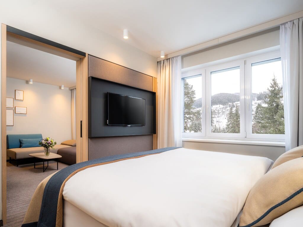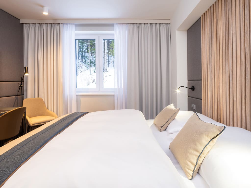 pokoj s manželskou postelí či oddělitelnými lůžky, s možností přistýlek pro 1 až 2 děti do nedovršených 12 let, sociální zařízení