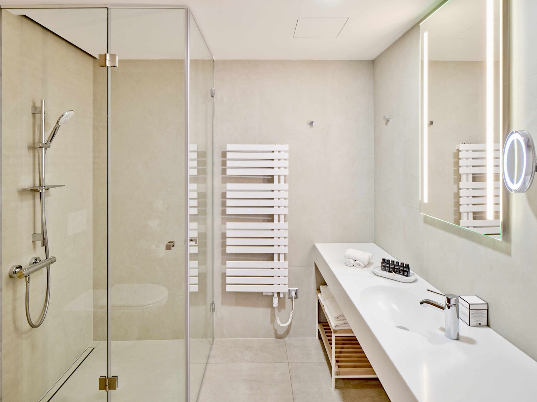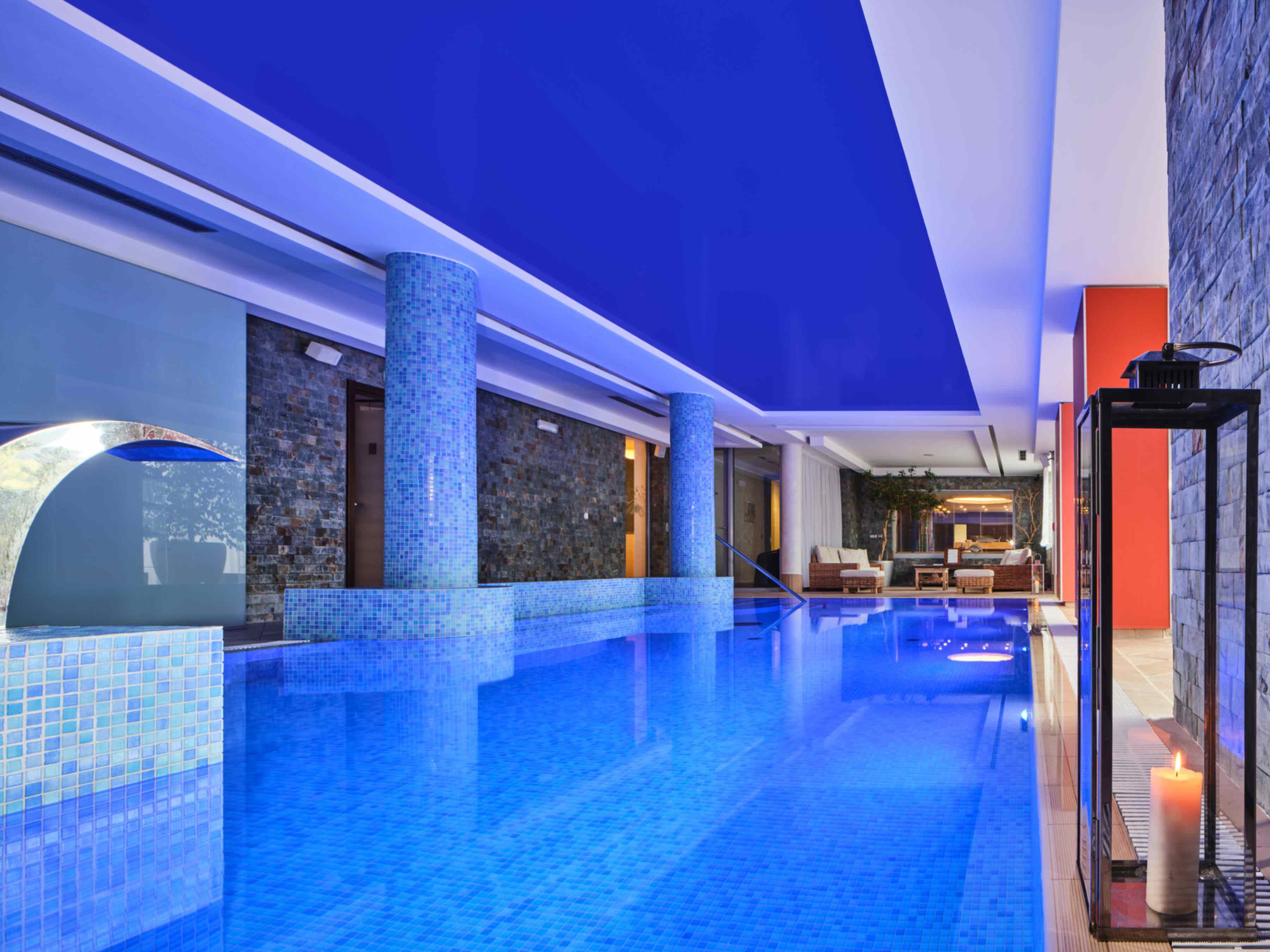 krytý bazén s atrakcemi, finská sauna, parní lázeň, odpočinková zóna s vyhlídkou a ochlazovací terasou, whirpool se slanou vodou, masáže*, L – Spa bar*