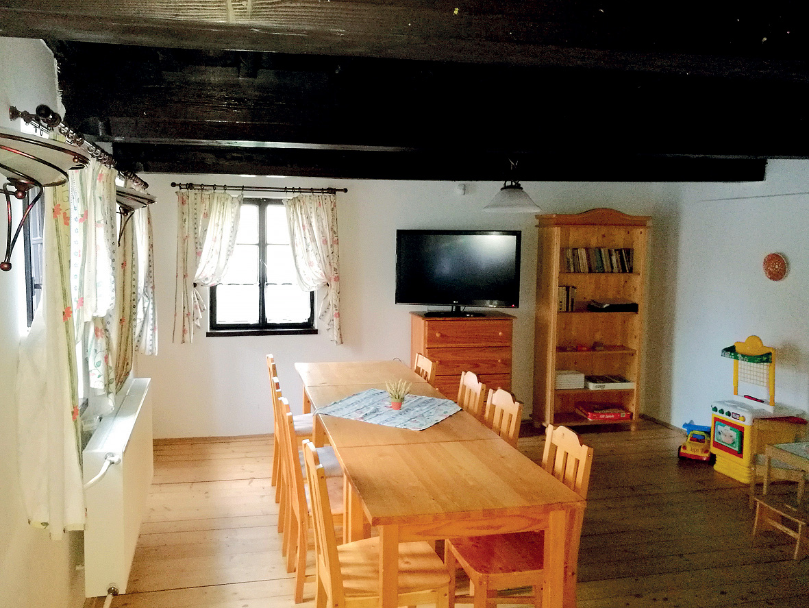 recepce, jídelna s TV sat., společenská místnost vyhrazená pro skupiny, velká zahrada s posezením a dětským hřištěm, dětský koutek, internet point / wi-fi připojení k internetu, úschovna lyží, vyhrazené parkoviště (počet míst omezen)