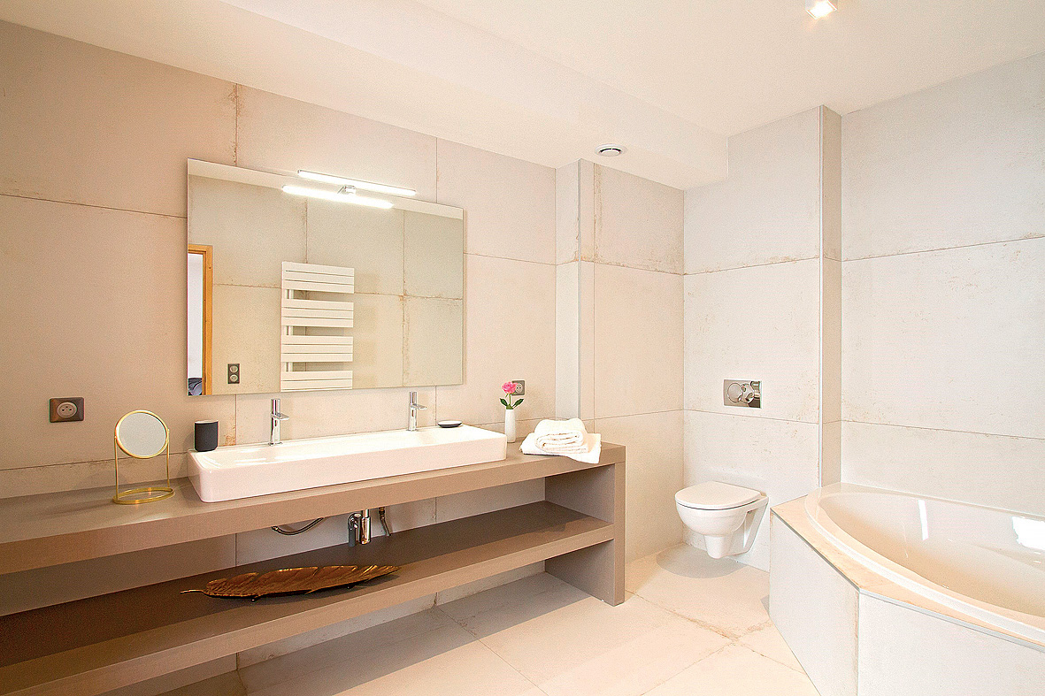 145 m² - 2 ložnice s manželskou postelí, 2 ložnice se 2 samostatnými lůžky, obývací pokoj s kuchyňským koutem, 3x sociální zařízení (2x se sprchou, 1x s vanou), balkon, venkovní vířivka