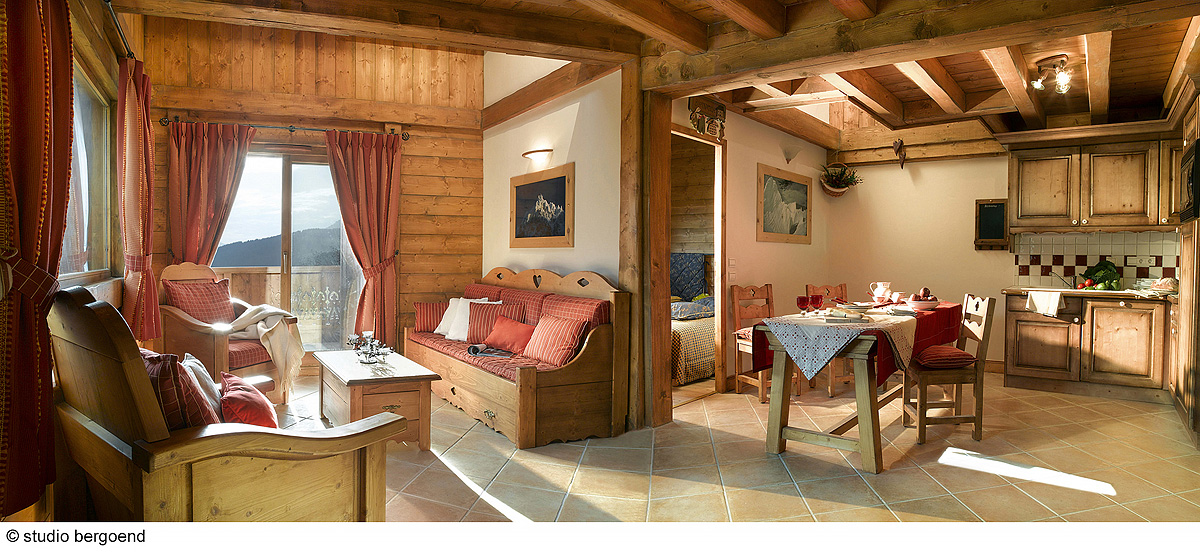 quadrilo 8 typ A - 65 m² - 1 ložnice s manželskou postelí, 1 ložnice se 2 samostatnými lůžky, kabina s palandou (vhodné pro děti od 6 do 14 let), obývací pokoj s kuchyňským koutem a rozkládacím gaučem pro 2 osoby (možno i typ "šuplík"), 2x sociální zařízení (1x se sprchou. 1x s vanou), balkon; některé apartmány jsou dvoupodlažní