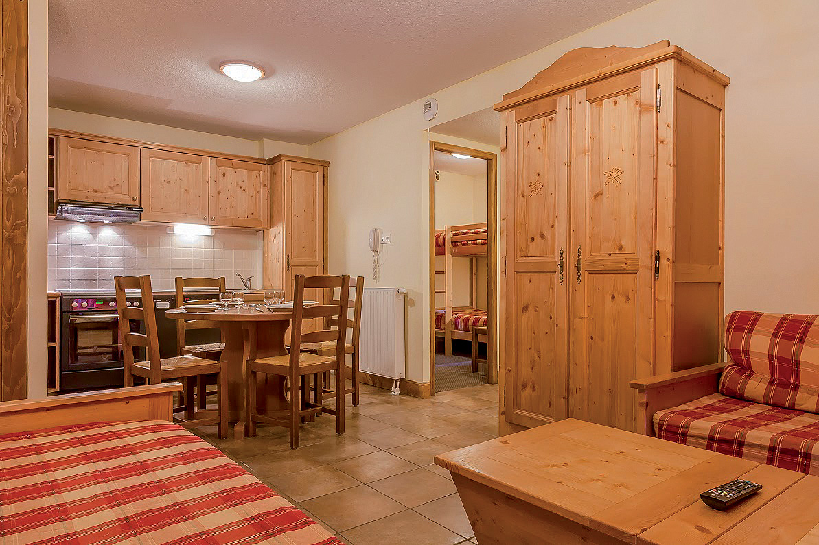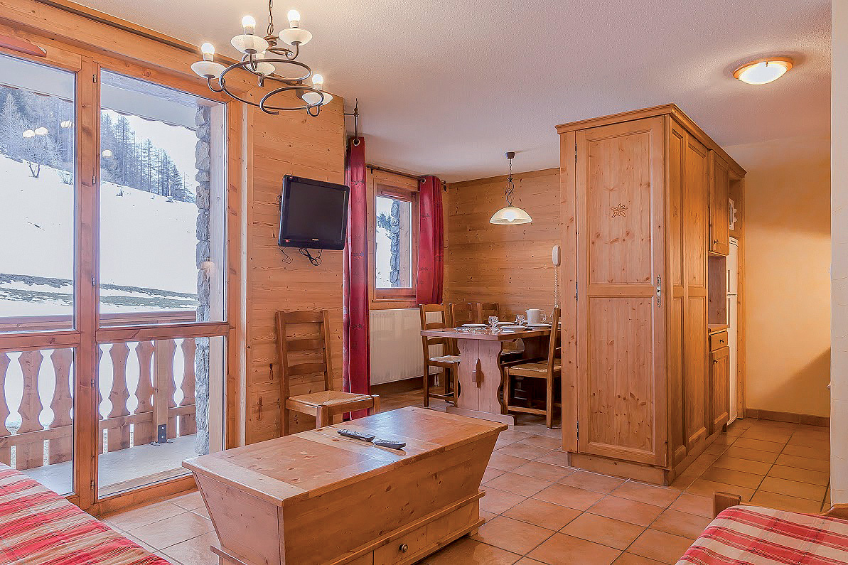 43 m² - 1 ložnice s manželskou postelí šíře 140 cm, 1 kabina s palandou, obývací pokoj s kuchyňským koutem a rozkládacím gaučem pro 2 osoby (možno i typ "šuplík"), 1x sociální zařízení (1x s vířivou vanou), 1x samostatné WC, balkon; některé apartmány jsou dvoupodlažní