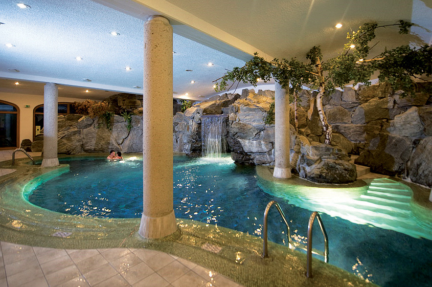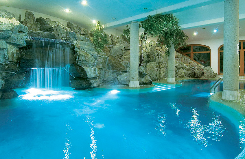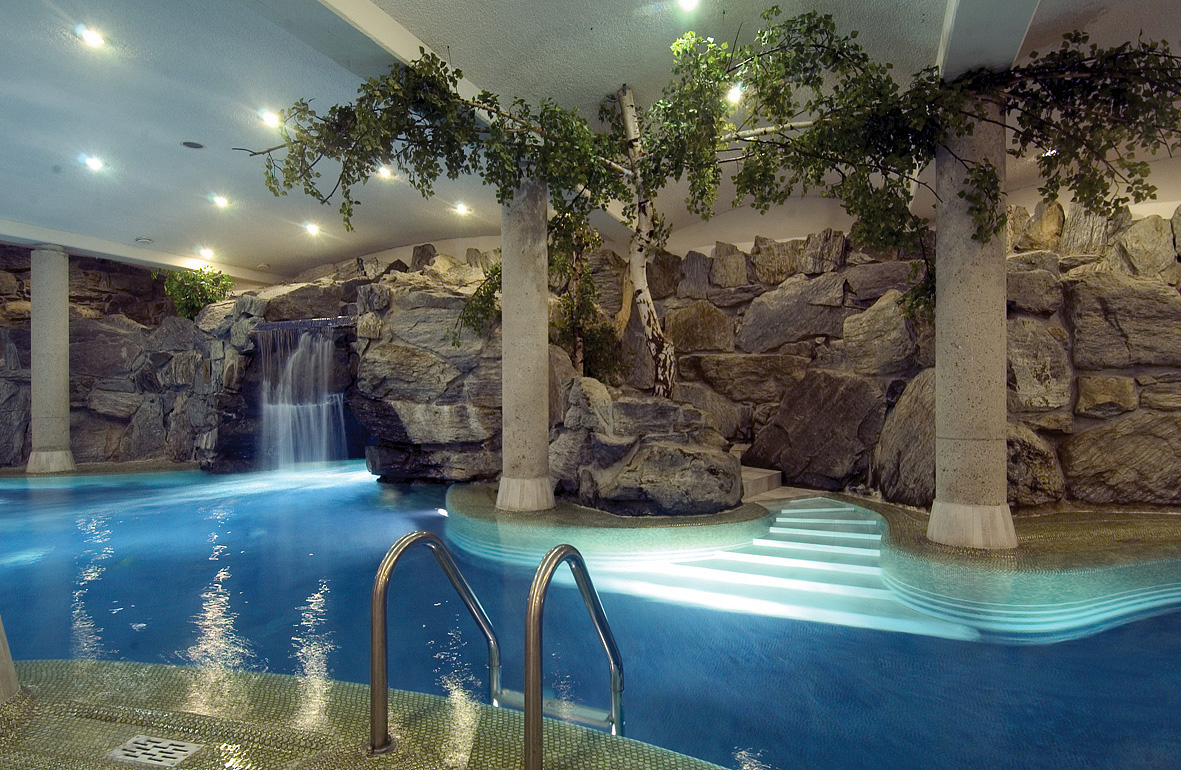 bazén s umělým vodopádem a skluzavkou, finská sauna, horizontální solárium*, masáže*, posilovna, stolní tenis, stolní fotbal