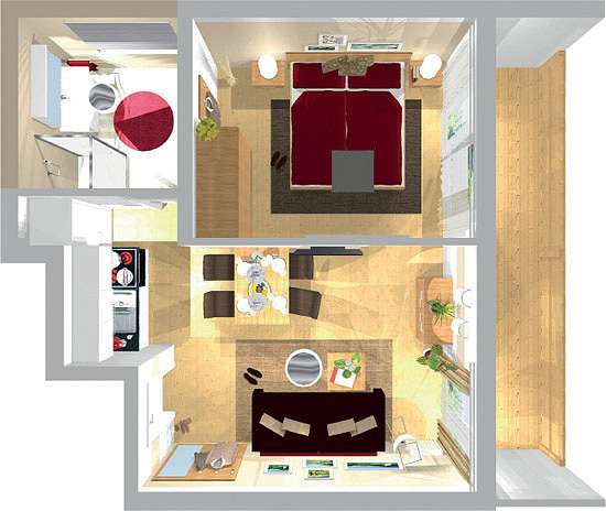 40 m² - 1 ložnice s manželskou postelí, obývací pokoj s rozkládacím gaučem pro 2 osoby a opticky odděleným kuchyňským koutem, sociální zařízení, balkon