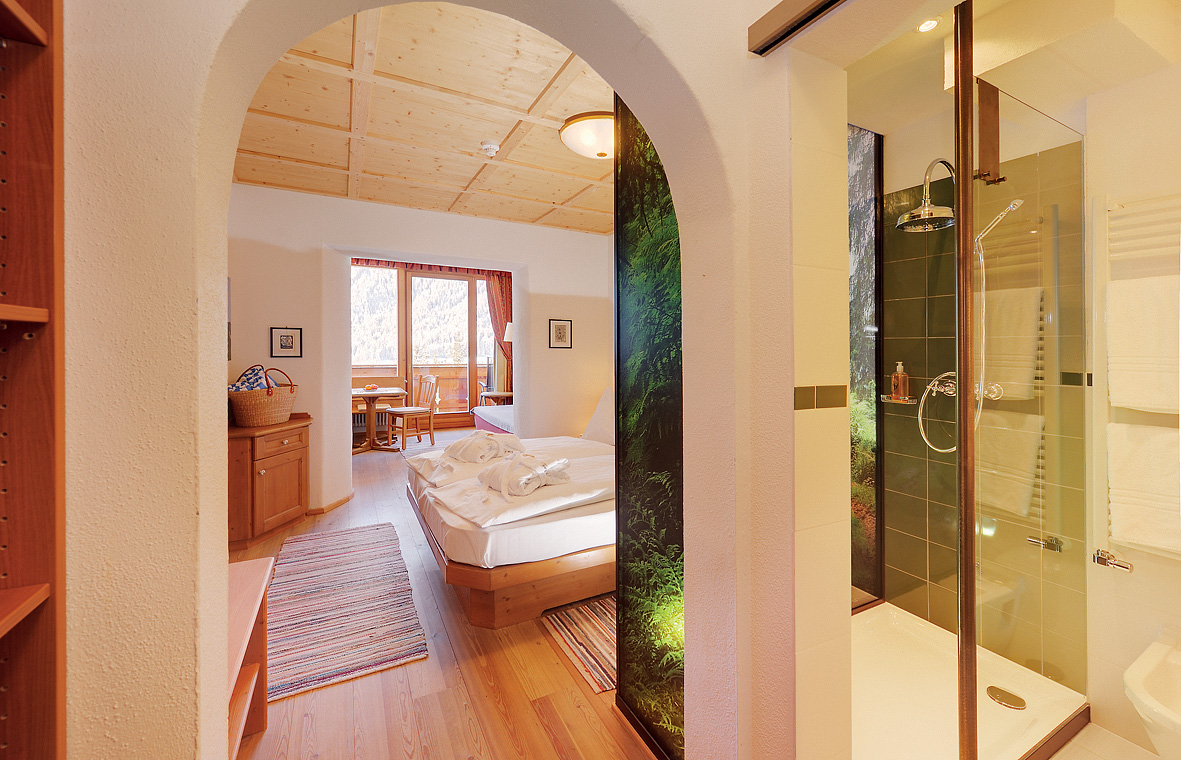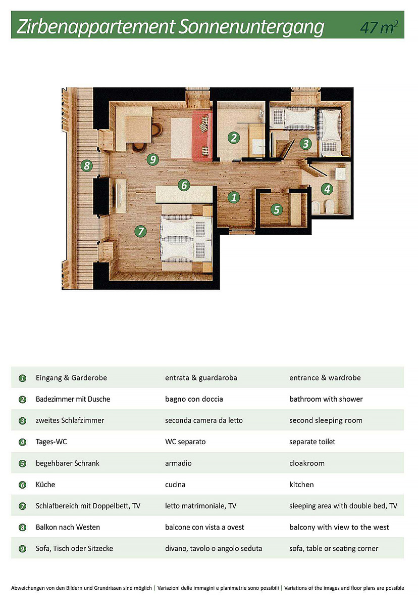 Zirbenappartment Tramonto 2/3/4 - 47 m² - pokoj se 2 samostatnými lůžky, obývací pokoj s manželskou postelí a uzavíratelným kuchyňským koutem, sociální zařízení se sprchou, 1x WC navíc, balkon