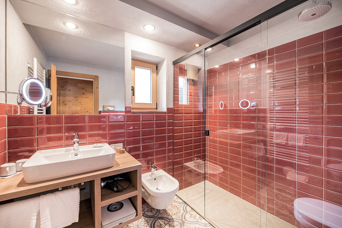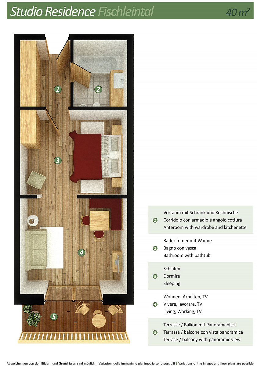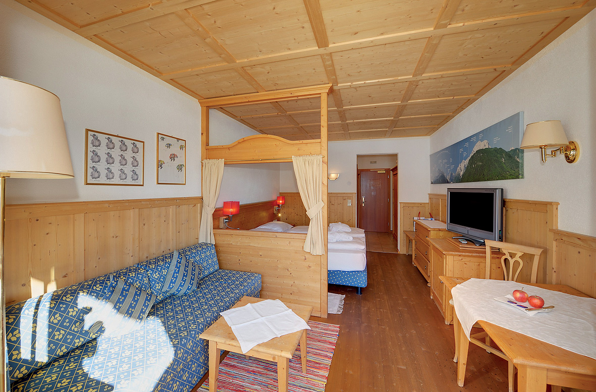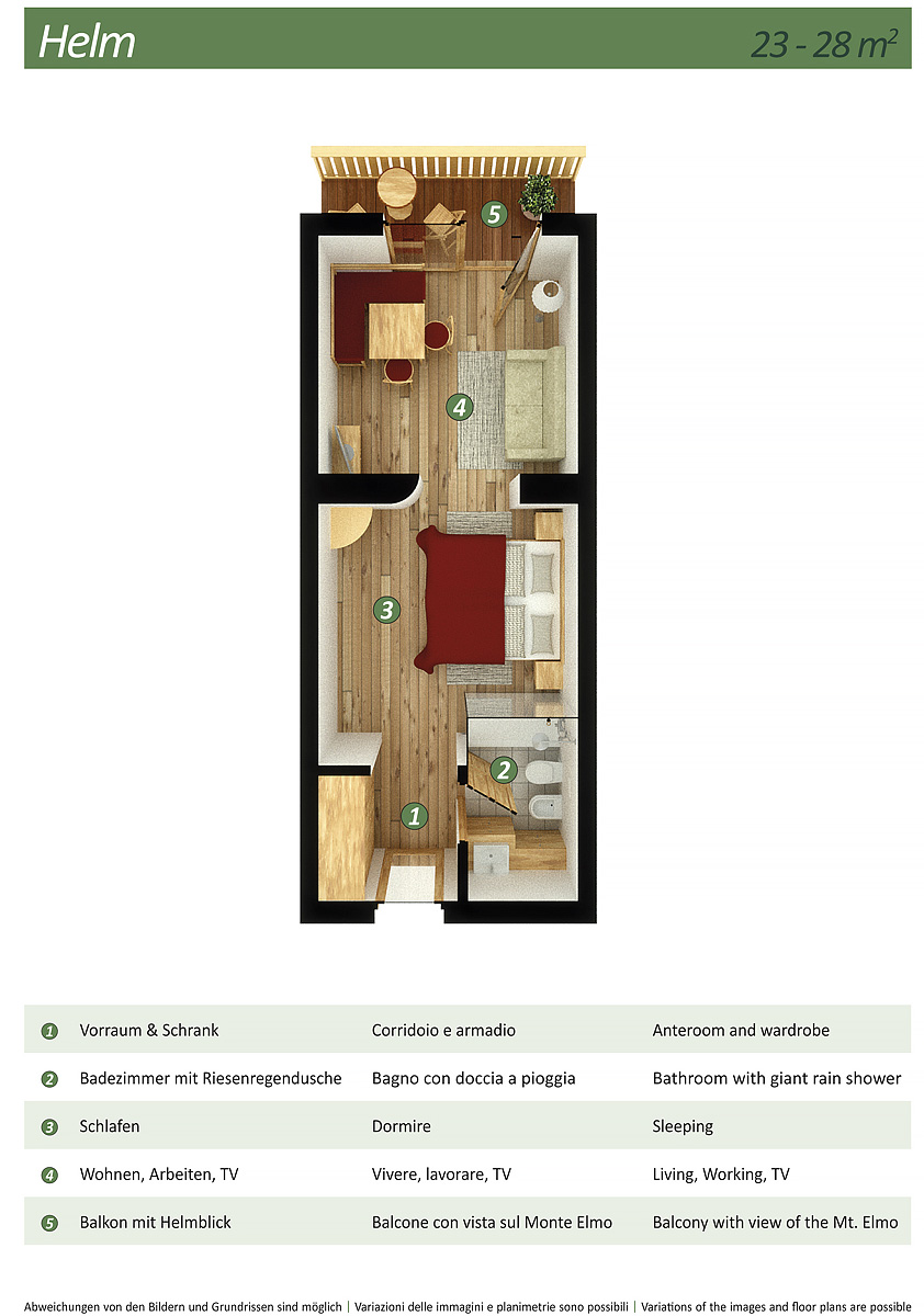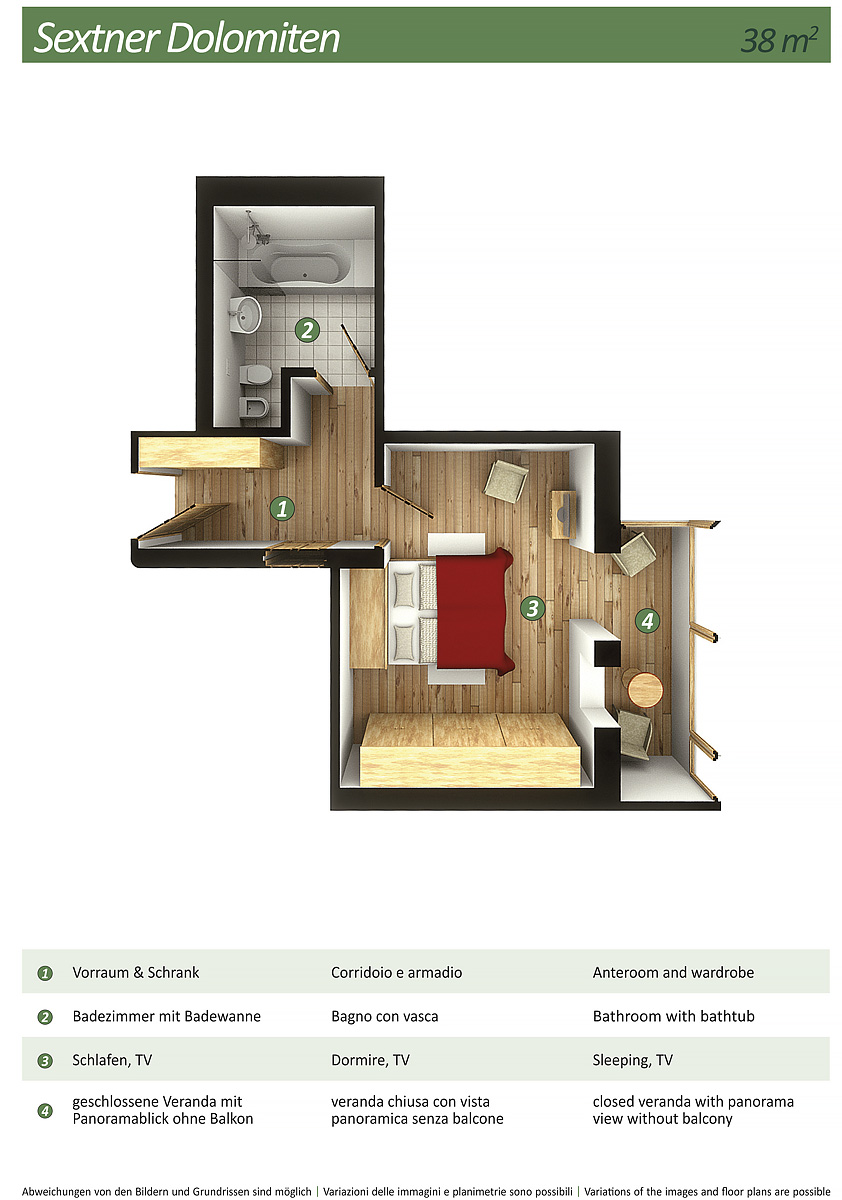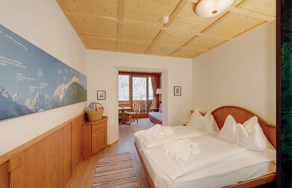 Dolomiti di Sesto 2/3 - 28 až 35 m² - pokoj s manželskou postelí a případně rozkládacím gaučem pro 1 osobu, sociální zařízení se sprchou či vanou, balkon