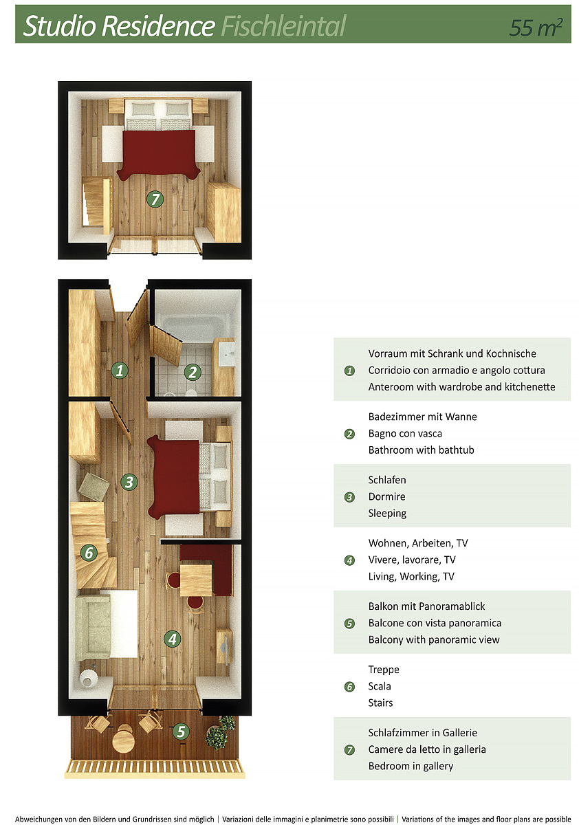 Studio Larice Mezonet 3/4/5 - 55 m² - pokoj s manželskou postelí, pokoj s manželskou postelí a rozkládacím gaučem pro 1 osobu v rámci zvýšeného patra, sociální zařízení se sprchou, balkon či terasa
