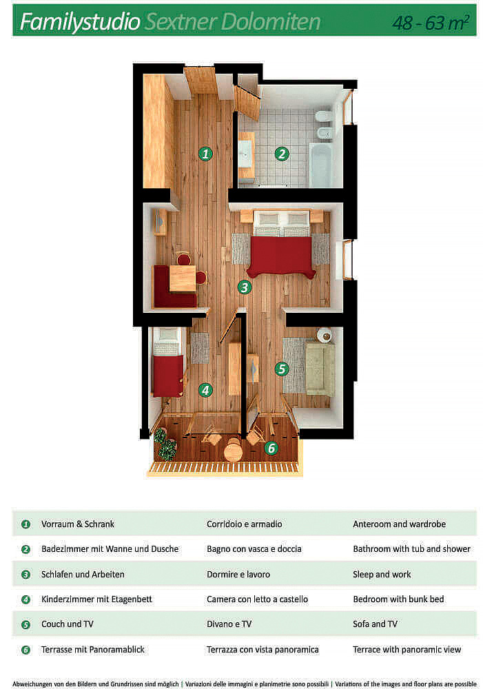 Family Studio Dolomiti Sesto 3/4/5 - 48 m² - pokoj s manželskou postelí a rozkládacím gaučem pro 1 osobu, pokoj s 2 samostatnými lůžky či palandou, sociální zařízení se sprchou, balkon