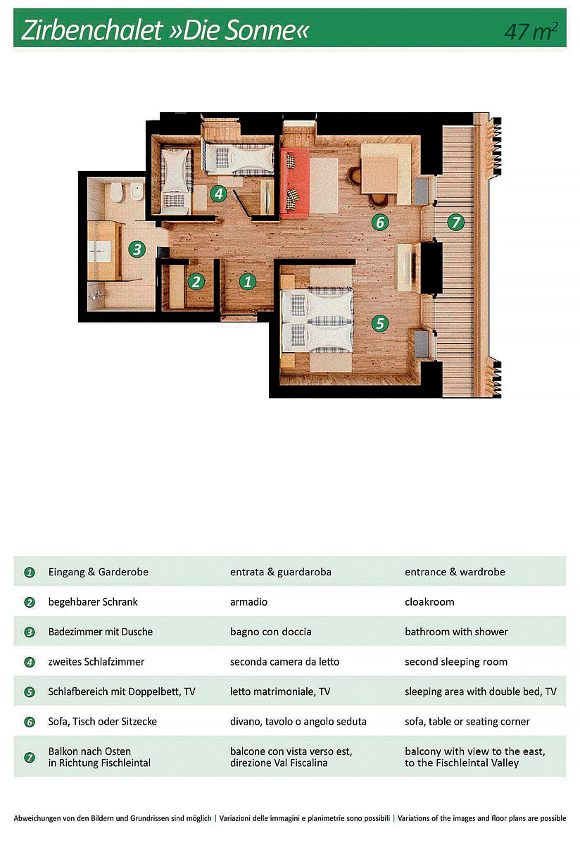 Zirbenchalet II Sole 2/3/4 - 47 m² - pokoj s manželskou postelí, pokoj se 2 samostatnými lůžky, sociální zařízení se sprchou, balkon