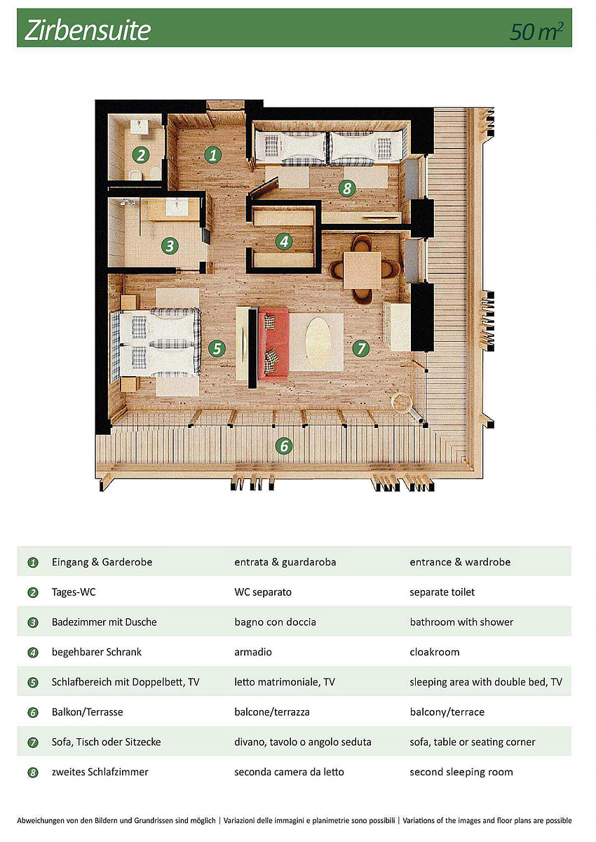 Zirben Suite 2/3/4 - 50 m² - pokoj s manželskou postelí, pokoj s 2 samostatnými lůžky, sociální zařízení se sprchou, balkon či terasa