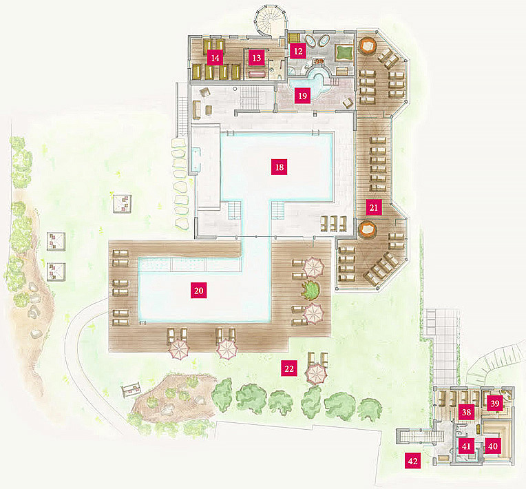 hotelový komplex se skládá ze 2 budov vzájemně propojených podzemní chodbou; pokoje Monte Casella, Cima Uno Style, Junior Suite Drei Zinnen a Moutain Suite Dolomiten se nachází v budově hlavní, pokoje Genziana, Family Arnica a Family Stella Alpina pak v budově vedlejší; všechny níže uvedené služby se nachází v budově hlavní