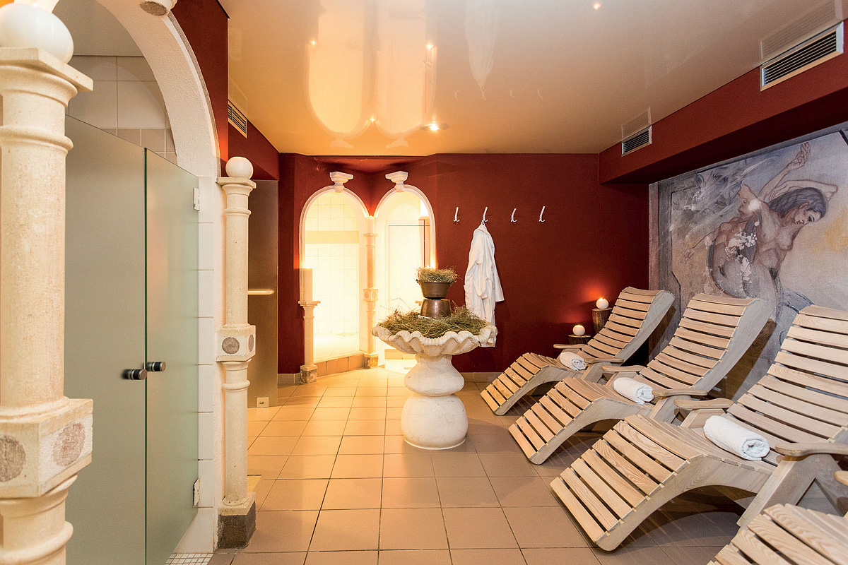 bazén nepravidelného tvaru 17 x 6 m s umělým vodopádem, vířivka až pro 12 osob, 2x sauna#, pára#, infrakabina#, 2x relaxační koutek# s lehátky, Kneippův chodník#, masáže#*, posilovna; služby označené # mohou využívat jen osoby od 18 let