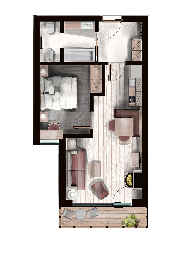 40 m² - 1 ložnice s manželskou postelí, obývací pokoj s kuchyňským koutem a rozkládacím gaučem pro 2 osoby, předsíň, sociální zařízení s vanou, balkon
