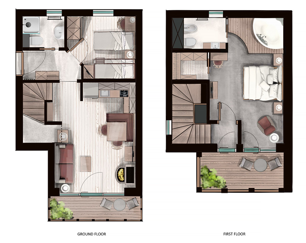 66 m² - 1. podlaží chaletu – 1 ložnice s 1 samostatným lůžkem a palandou, obývací pokoj s kuchyňským koutem, předsíň, sociální zařízení, balkon; 2 podlaží chaletu – 1 ložnice s manželskou postelí a hydromasážní vanou, komora, samostatné WC, balkon