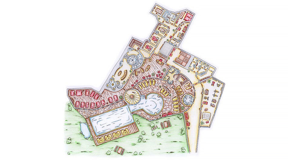 bazén, venkovní bazén, dětský bazének, venkovní finská sauna, rodinná sauna, pára, relaxační koutek s lehátky, Kneippův chodník, masáže*, kosmetické služby*, vzdušný hokej
