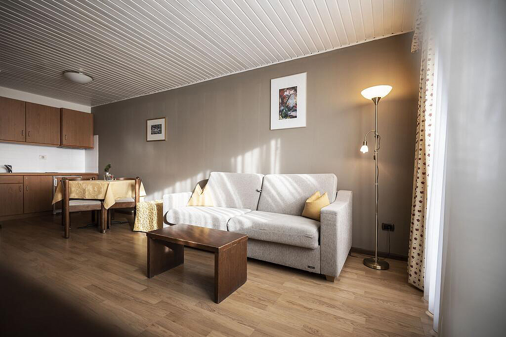 40 m² - 1 ložnice s manželskou postelí, obývací pokoj s kuchyňským koutem, rozkládacím gaučem pro 2 osoby a rozkládacím křeslem na lůžko pro 1 osobu, sociální zařízení s vanou, zřídka balkon