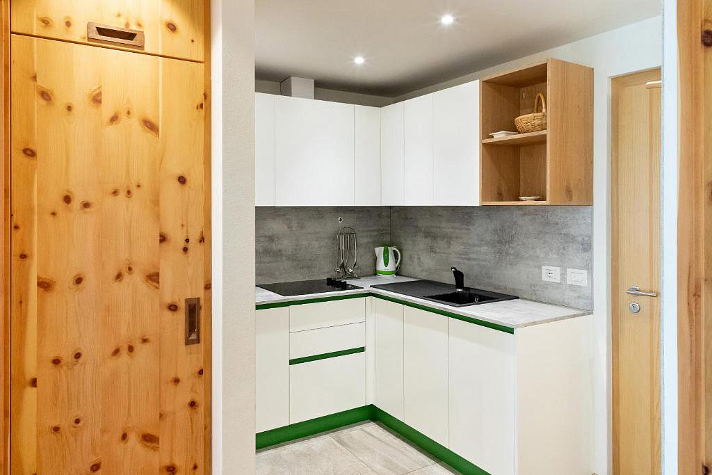 38 m² – 1 ložnice s manželskou postelí, obývací pokoj s kuchyňským koutem a rozkládacím gaučem pro 1 osobu, sociální zařízení, balkon; maximální obsazenost apartmánu jsou 2 dospělé osoby a 1 dítě do nedovršených 14 let