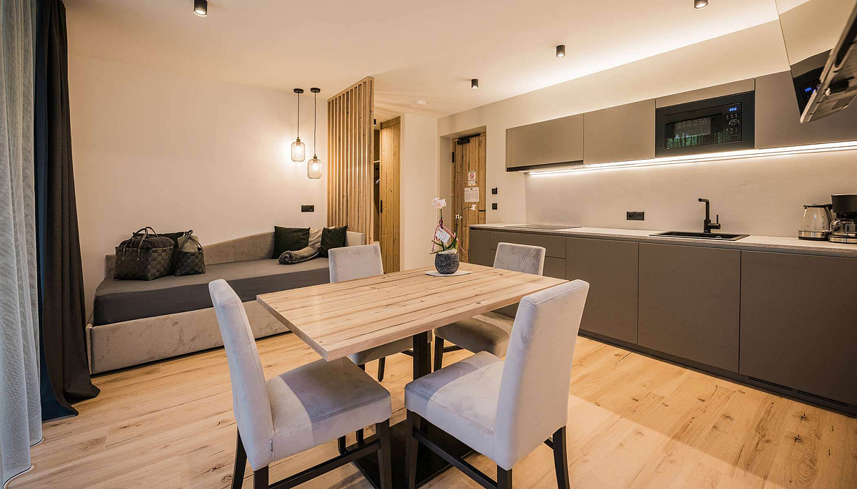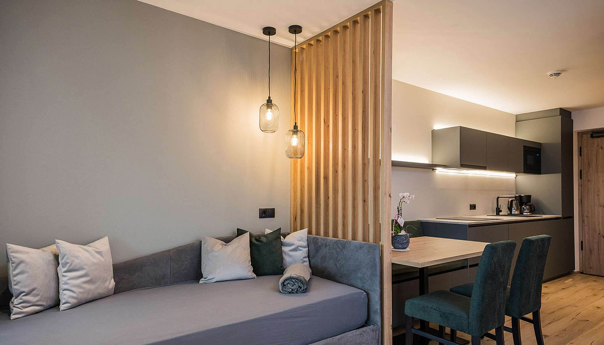 mono 4 Dolomiti - 31 až 37 m² – obývací pokoj s kuchyňským koutem, částečně oddělenou manželskou postelí a rozkládacím gaučem pro 2 osoby, sociální zařízení, balkon