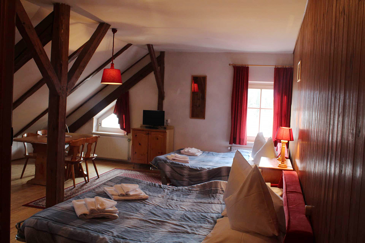 40 m² – obývací pokoj s malým kuchyňským koutem a 2 rozkládacími gauči pro 2 osoby, sociální zařízení