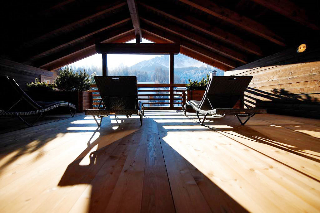 trilo 5 Sigrid Superior - 63 m² - 1 ložnice s manželskou postelí, 1 ložnice s palandou, obývací pokoj s kuchyňským koutem, tyrolskými kamny a rozkládacím gaučem pro 1 osobu, 2x sociální zařízení se sprchou či vanou, velká panoramatická terasa (40 m²)