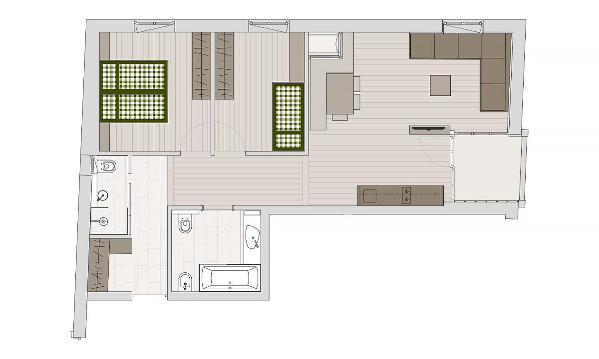 trilo 5 Sigrid Plus - 63 m² - 1 ložnice s manželskou postelí, 1 ložnice s palandou, obývací pokoj s kuchyňským koutem, tyrolskými kamny a rozkládacím gaučem pro 1 osobu, 2x sociální zařízení se sprchou či vanou