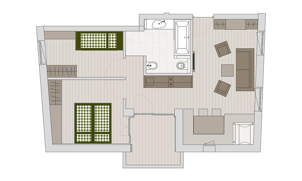 trilo 5 Sigrid - 60 m² - 1 ložnice s manželskou postelí, 1 ložnice s palandou, obývací pokoj s kuchyňským koutem, tyrolskými kamny a rozkládacím gaučem pro 1 osobu, sociální zařízení se sprchou či vanou, balkon