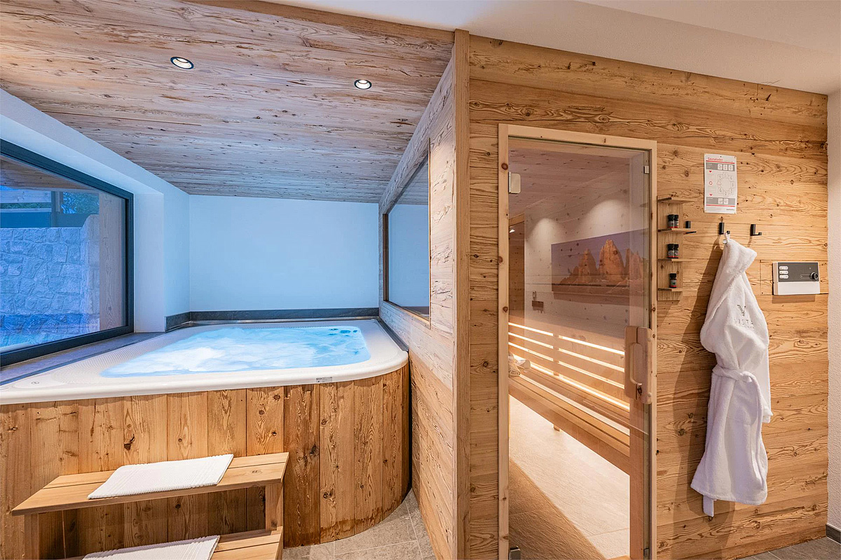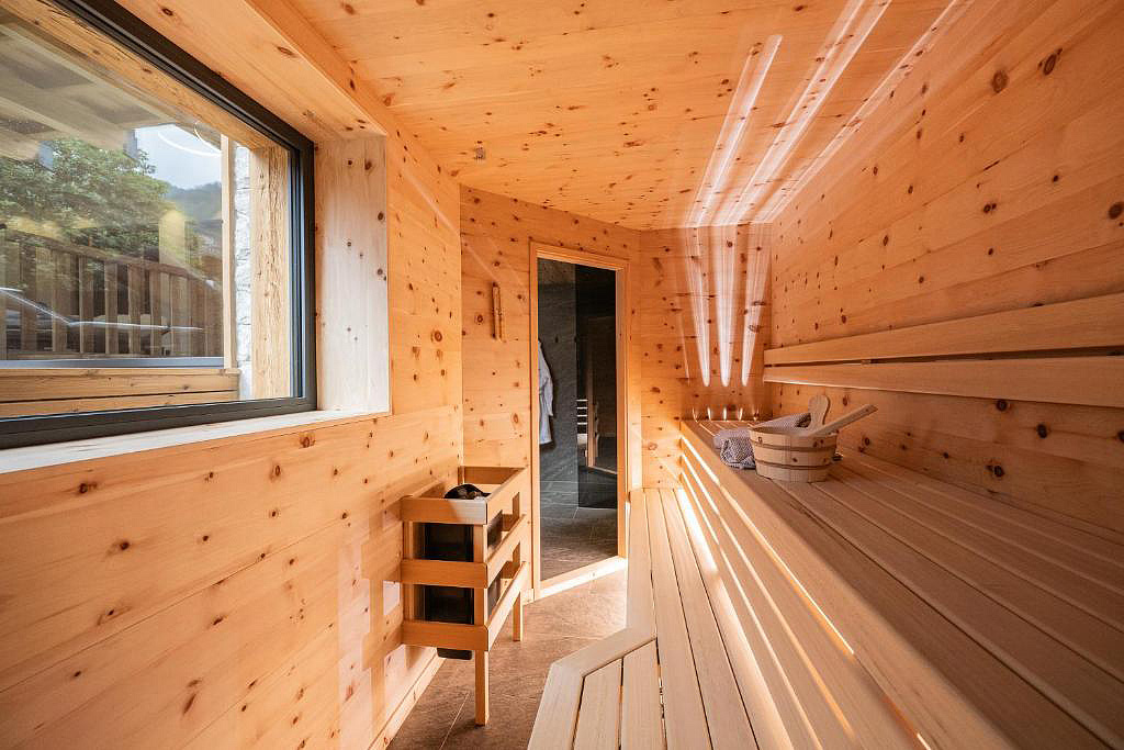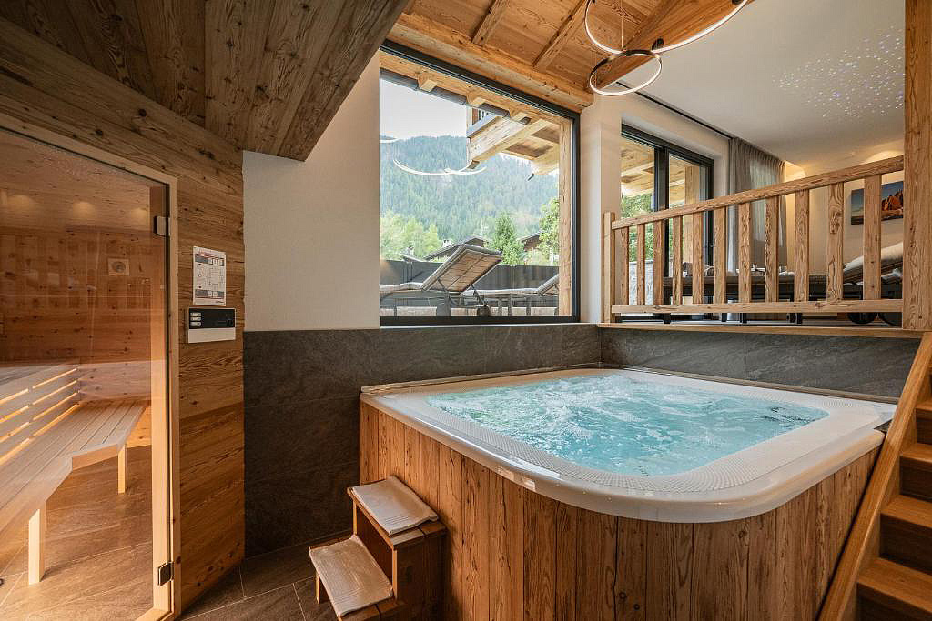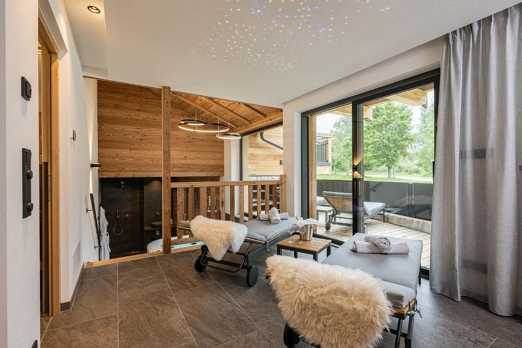 sauna, vířivka až pro 6 osob a relaxační koutek s lehátky v každém chaletu