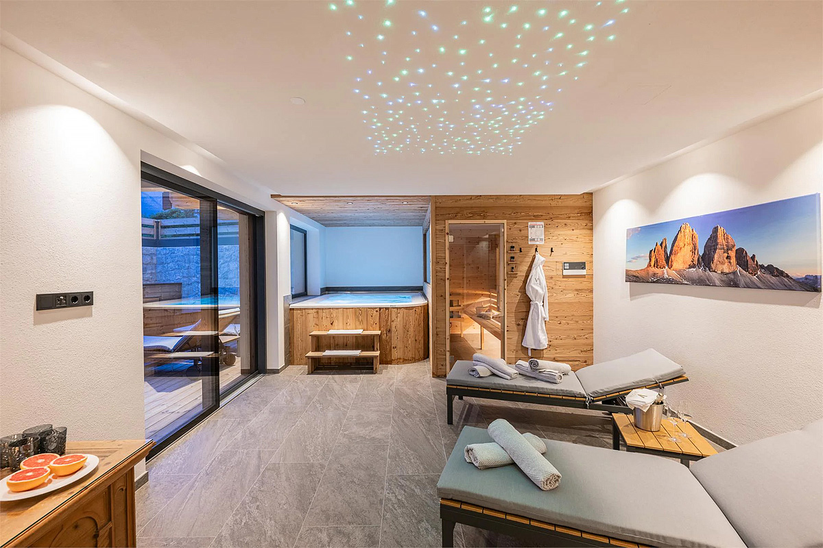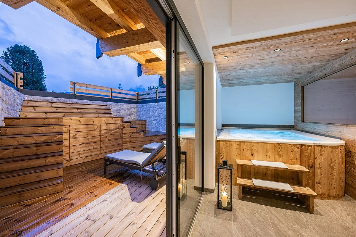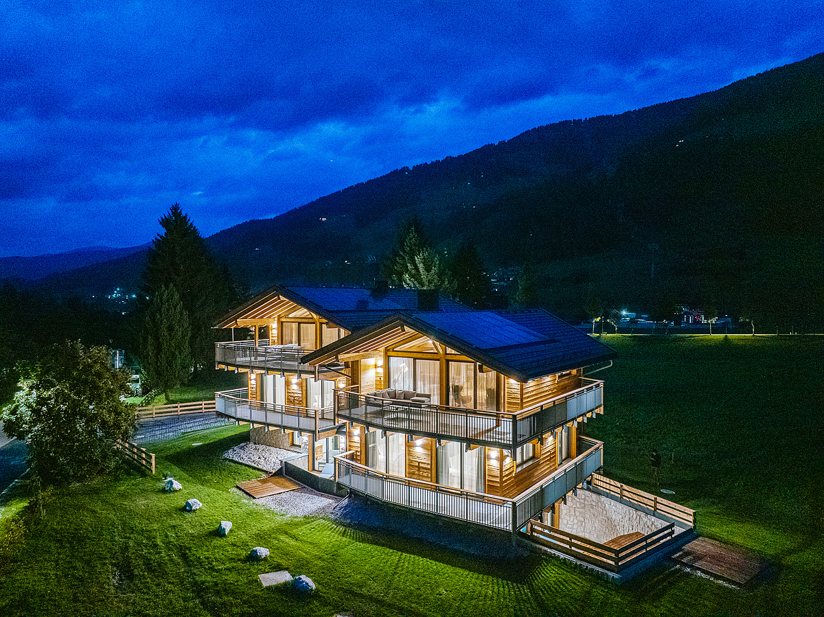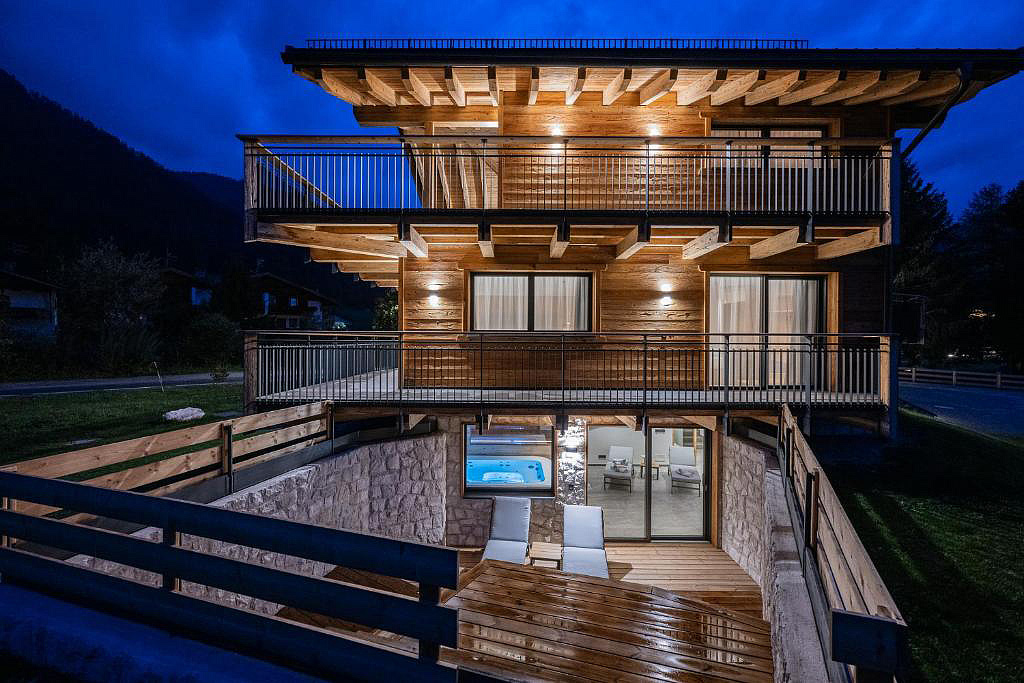 novostavba 2 třípodlažních chaletů v blízkosti kabinové lanovky na Monte Elmo; privátní sauna, vířivka a relaxační koutek s lehátky je součástí každého chaletu