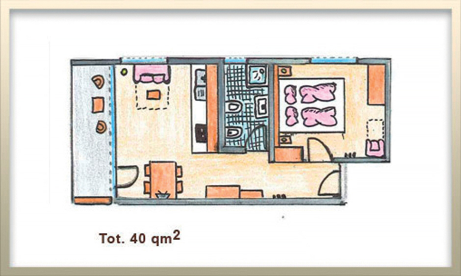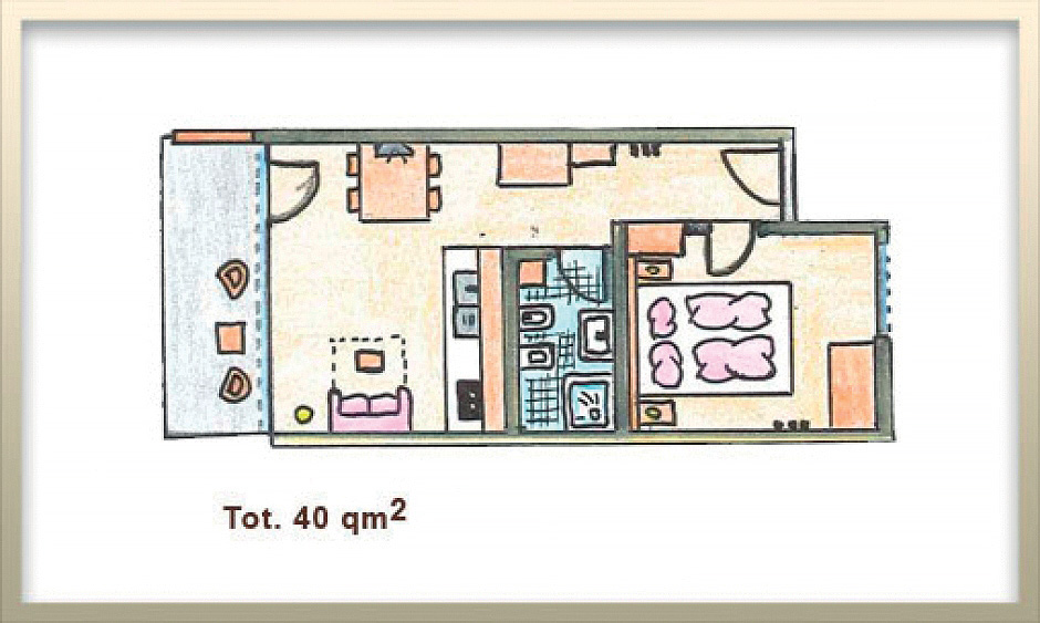 bilo 4 - 40 m² - 1 ložnice s manželskou postelí, obývací pokoj s kuchyňským koutem a rozkládacím gaučem pro 2 osoby, sociální zařízení, balkon
