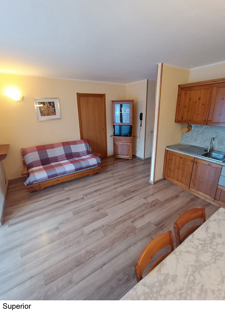 40 m² - 1. podlaží apartmánu: obývací pokoj s kuchyňským koutem a rozkládacím gaučem pro 2 osoby, nově zrekonstruované sociální zařízení, balkon; 2. podlaží apartmánu: 1 ložnice s manželskou postelí a skříňovým rozkládacím lůžkem pro 1 osobu, sociální zařízení (jen umyvadlo či bidet a WC), balkon