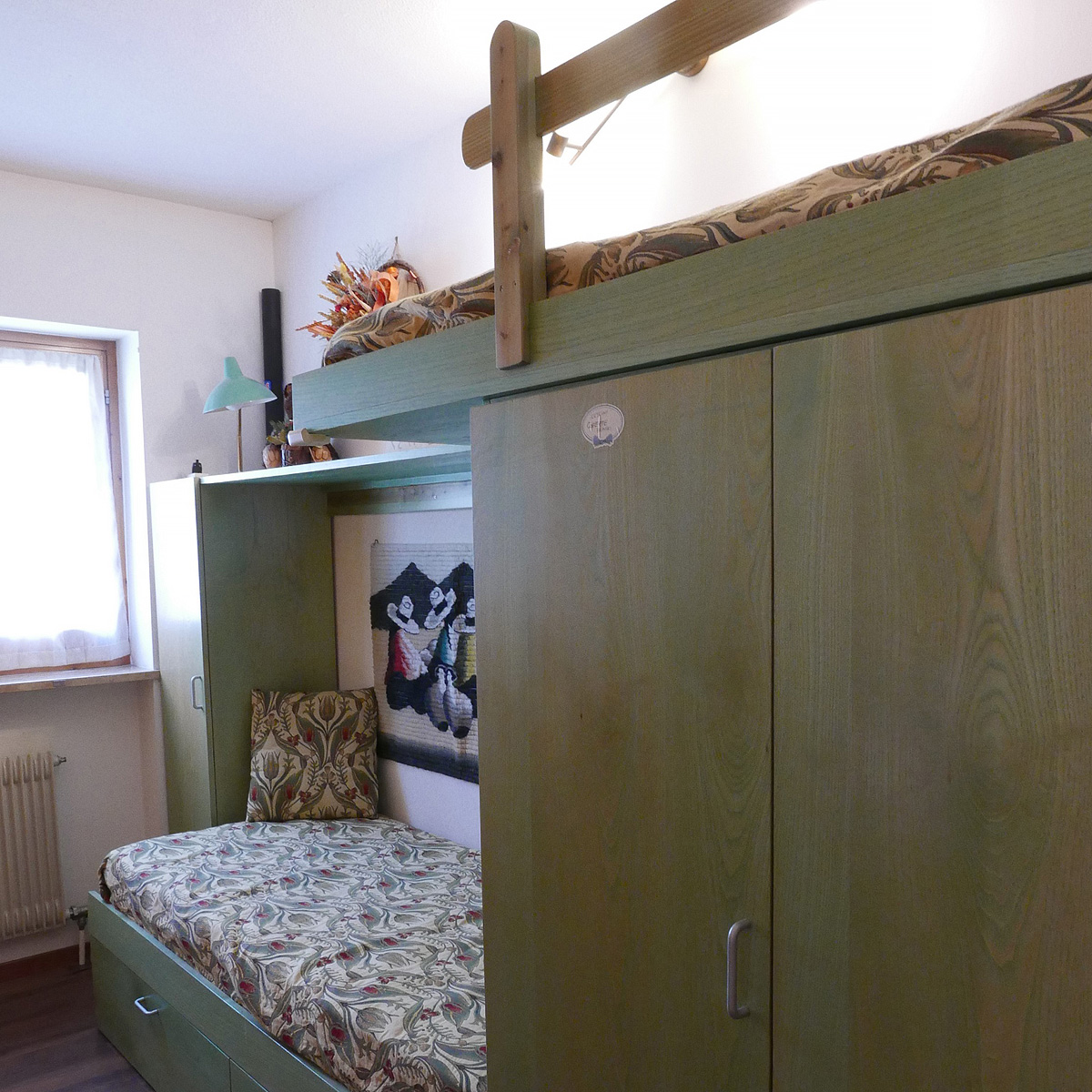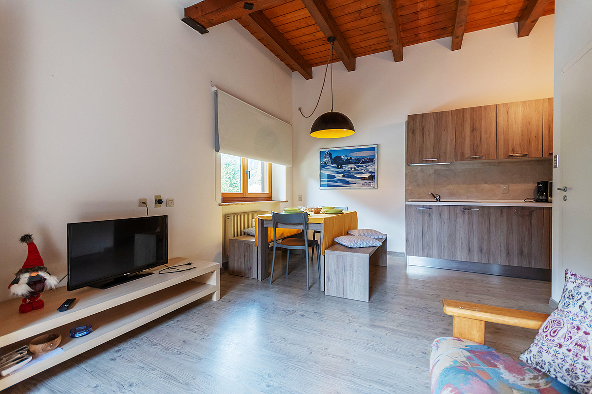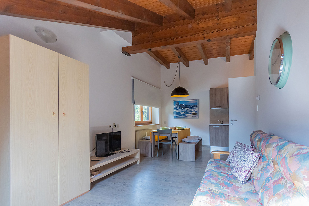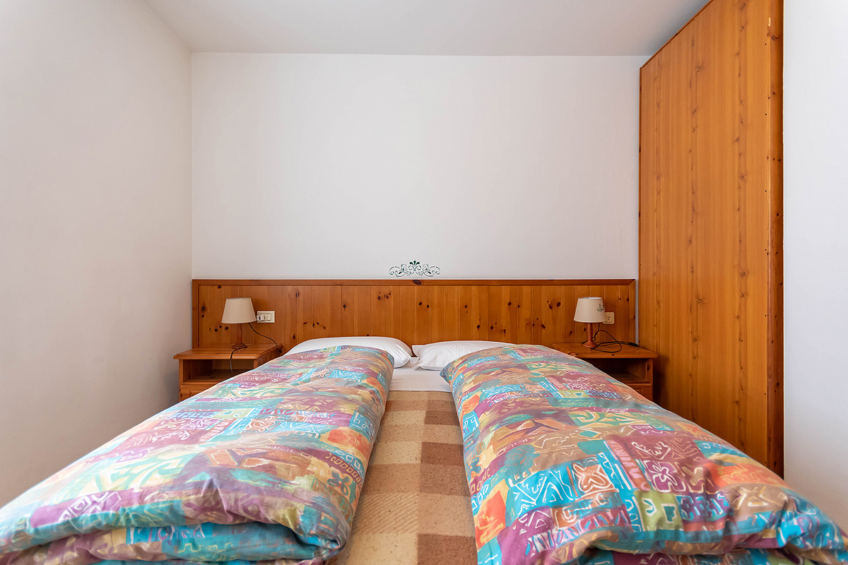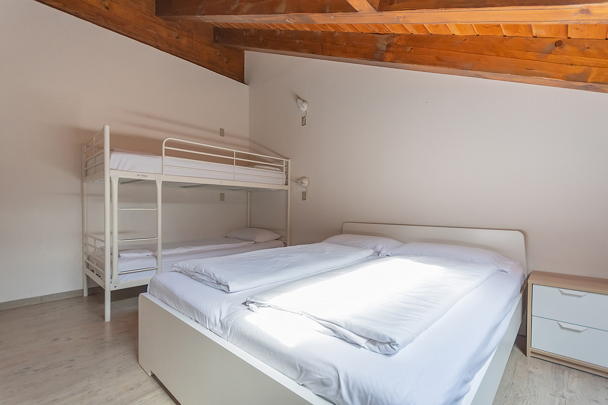 45 m² - 1 ložnice s manželskou postelí, 1 ložnice s palandou, obývací pokoj s kuchyňským koutem a rozkládacím gaučem pro 2 osoby, sociální zařízení, balkon; přestože je k dispozici 6 lůžek, vzhledem k nízkému prostotu pod stropem u vrchního lůžka palandy je maximální možná obsazenost 5 osob
