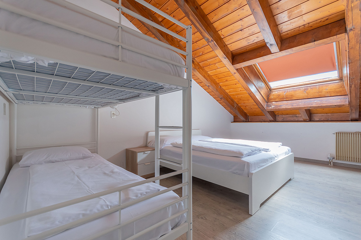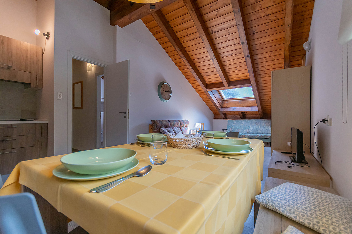 45 m² - 1 ložnice s manželskou postelí a palandou, obývací pokoj s kuchyňským koutem a rozkládacím gaučem pro 2 osoby, sociální zařízení; apartmán je situován v podkroví dvoupodlažní budovy