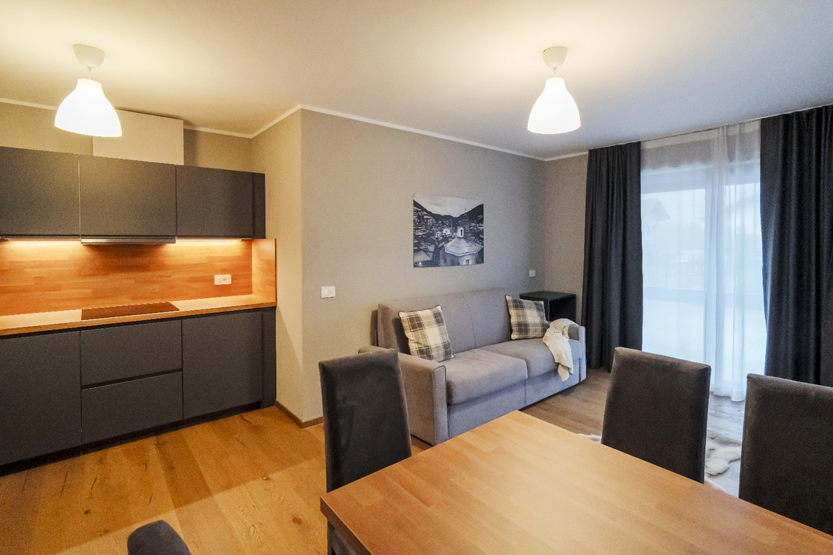 55 m² - 1 ložnice s manželskou postelí a 2 samostatnými lůžky, 1 samostatné lůžko v chodbě, obývací pokoj s kuchyňským koutem a rozkládacím gaučem pro 2 osoby, sociální zařízení se sprchou, oplocená terasa; apartmán se nachází v přízemí; vhodný i jako bezbariérový